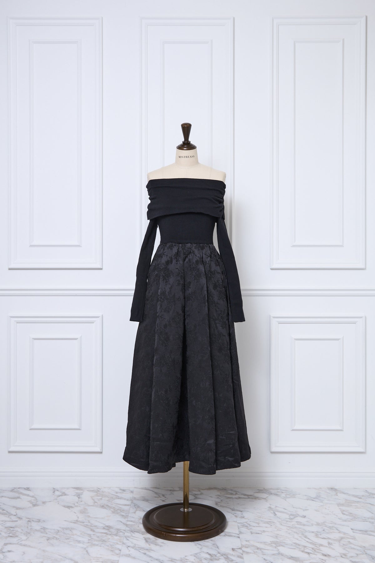 上身に伸縮性のあるタイトニットを使用し、女性らしいラインを美しく引き立てるドッキングワンピース。オフショルデザインでデコルテを華奢に魅せつつ、スカート部分はジャガード生地を贅沢に用いドラマティックに広がるシルエットに仕上げました。前ウエストのVカット切り替えがスタイルアップ効果をプラス。1枚でクラシカルな華やかさを放ち、特別なシーンにも映える主役級のドレスです。
