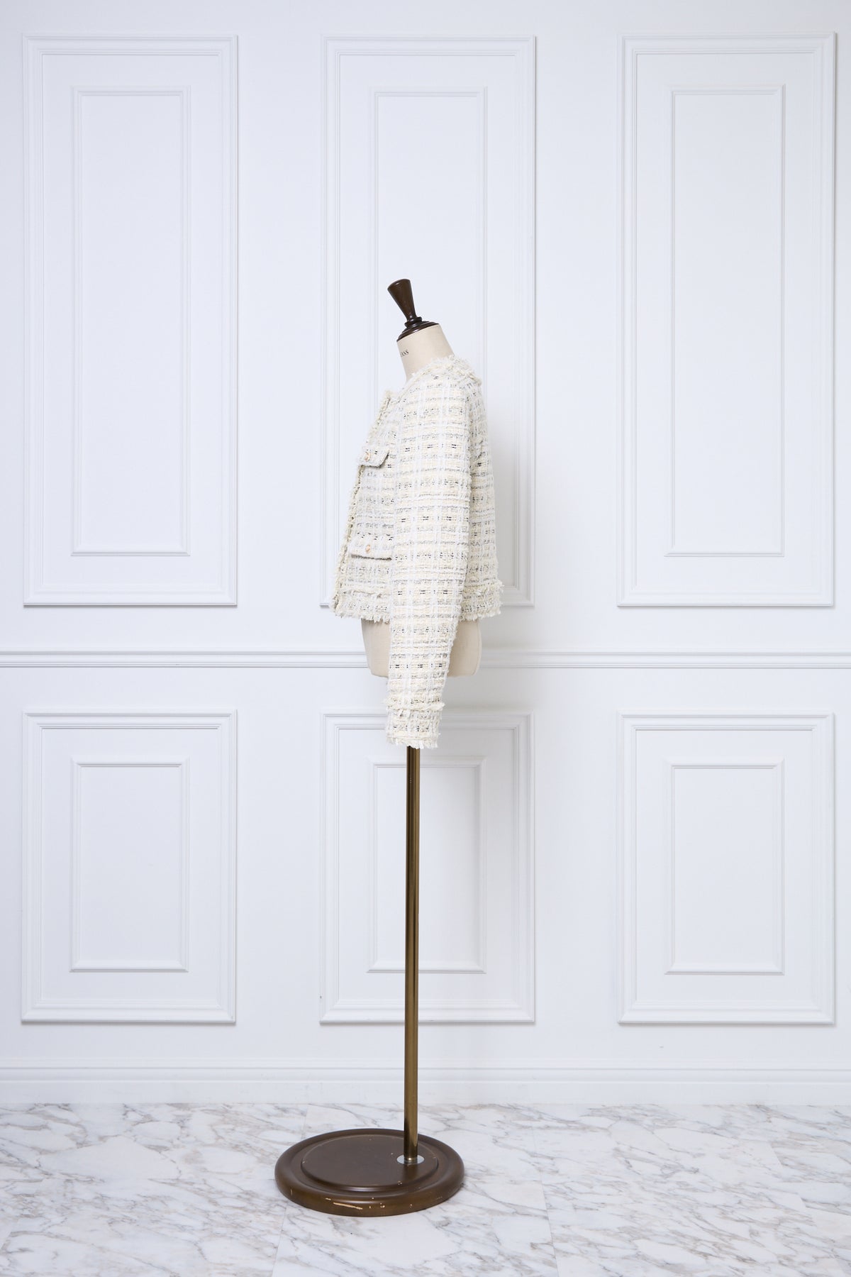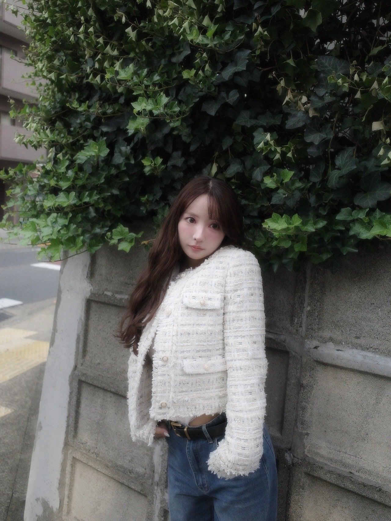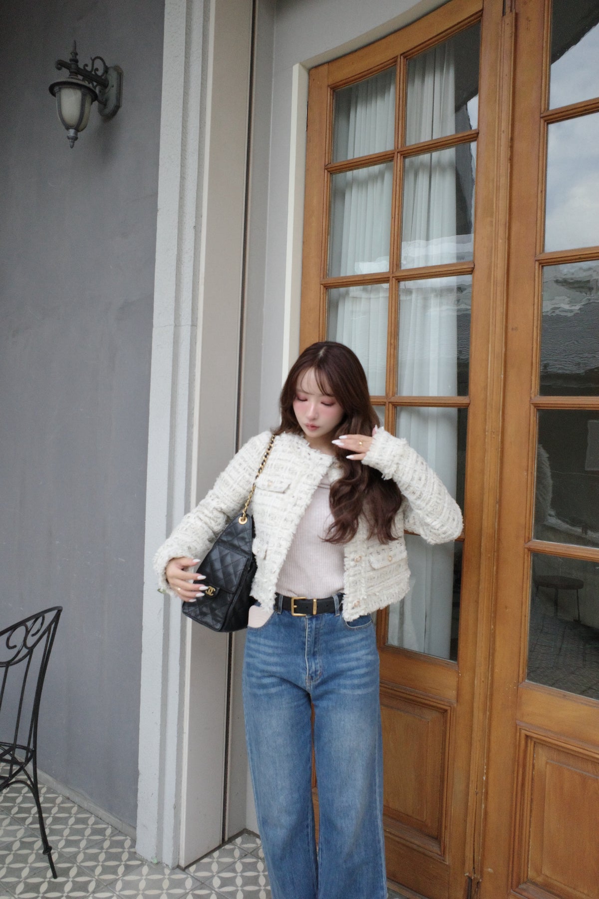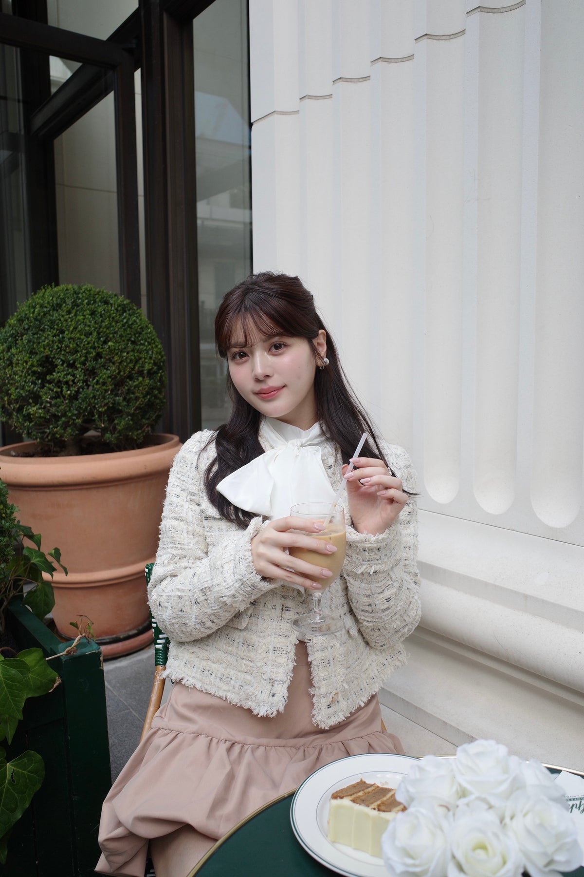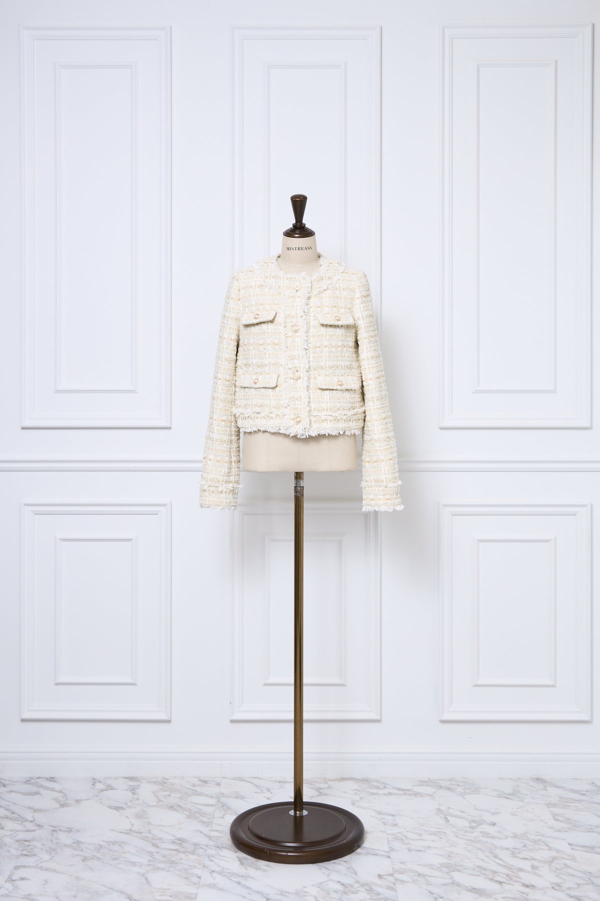 フリンジがほどよい甘さを添えるツイードジャケット。あえてコンパクトにし過ぎないシルエットで、ガーリーな雰囲気の中にもリラックス感を演出します。デニムを合わせればカジュアルガーリーに、ふんわりスカートで王道フェミニンに、ミニボトムならあざと可愛い印象に。クラシカルなツイードをデイリーに取り入れられる、他にはないレディーな一枚です。