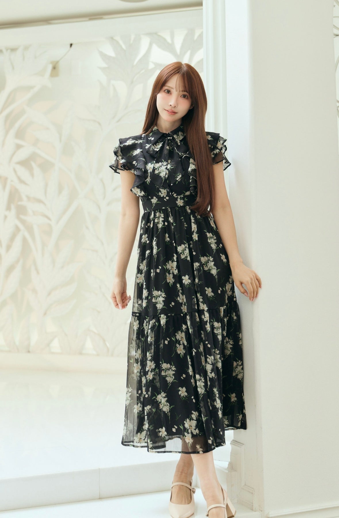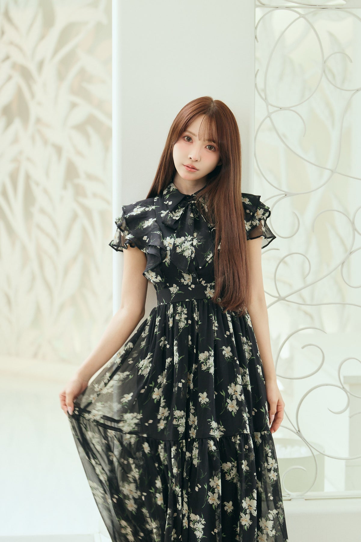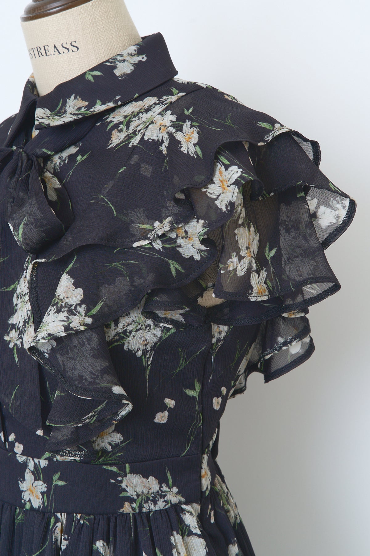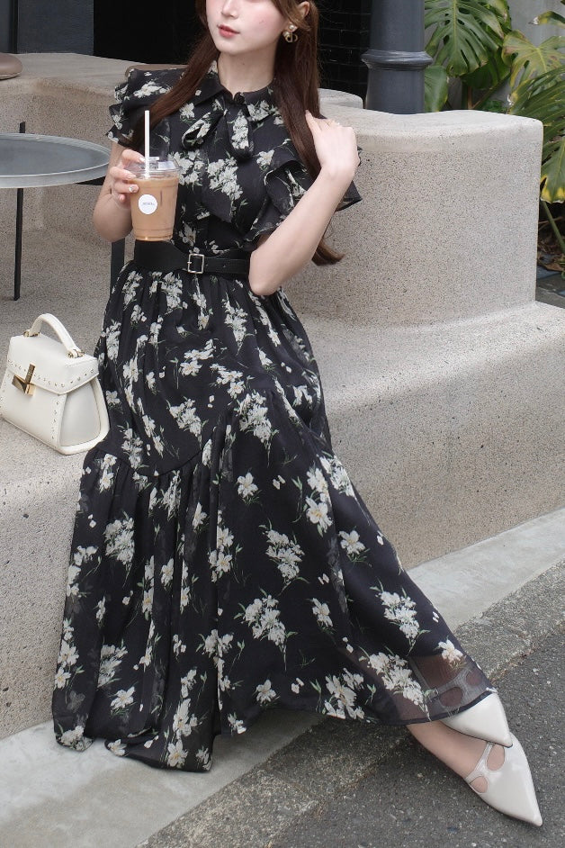 毎年人気のベルト付きのフラワードレス。今年は透け感のある楊柳素材でご用意しました。二の腕をカバーしてくれるフリルスリーブと取り外し可能なベルトでウエストマークし、スタイルアップも叶います。肌馴染みの良いベージュ、柔らかな雰囲気のブルー、白いお花が目立つ定番のブラックの三色展開です。