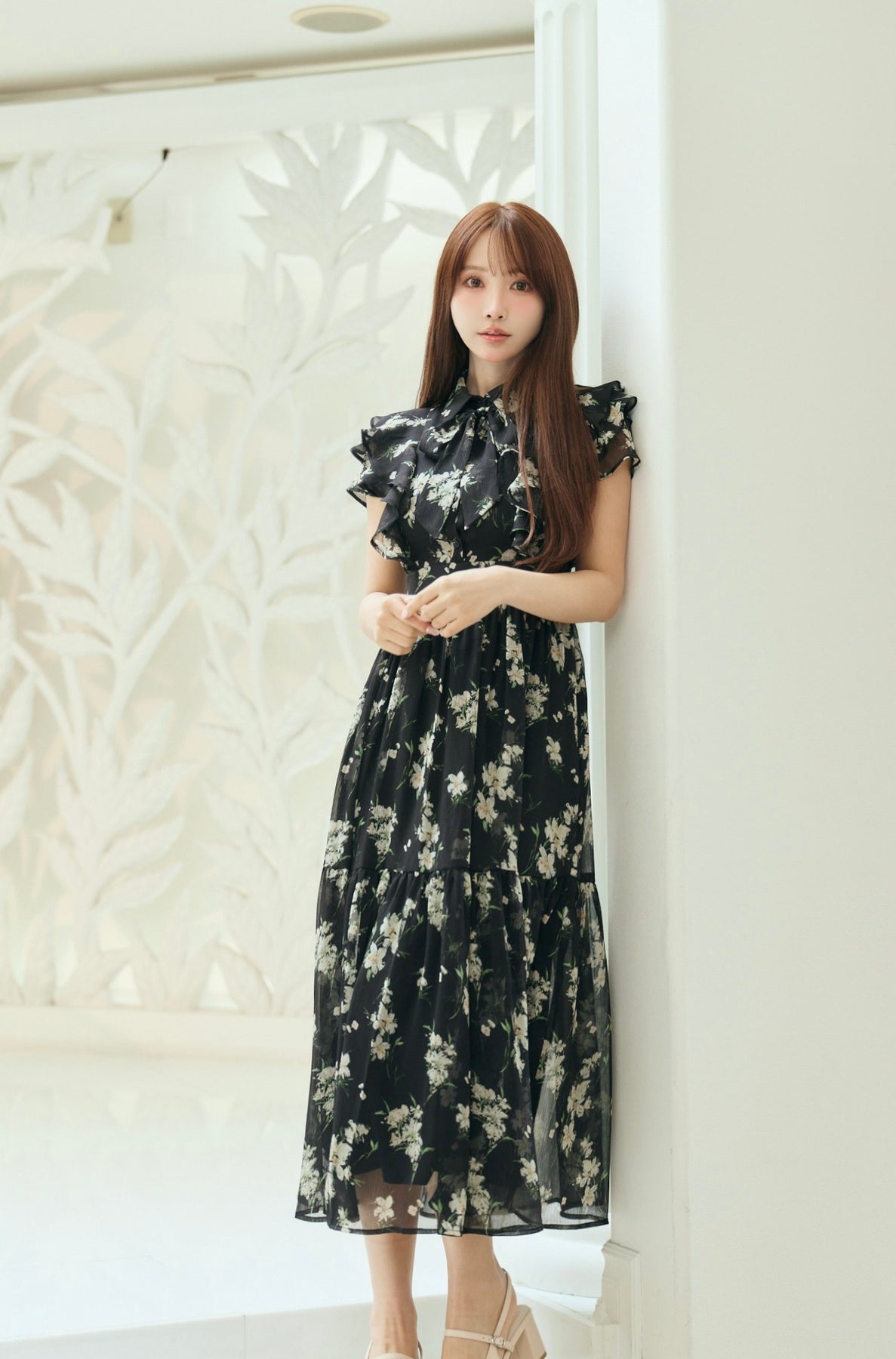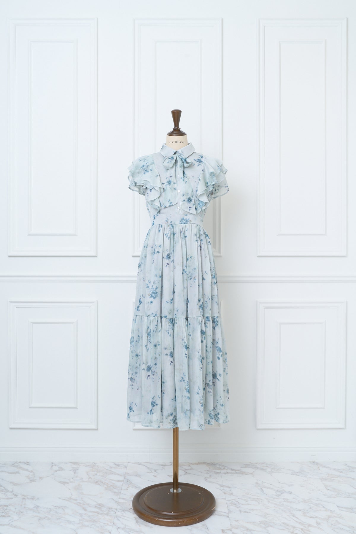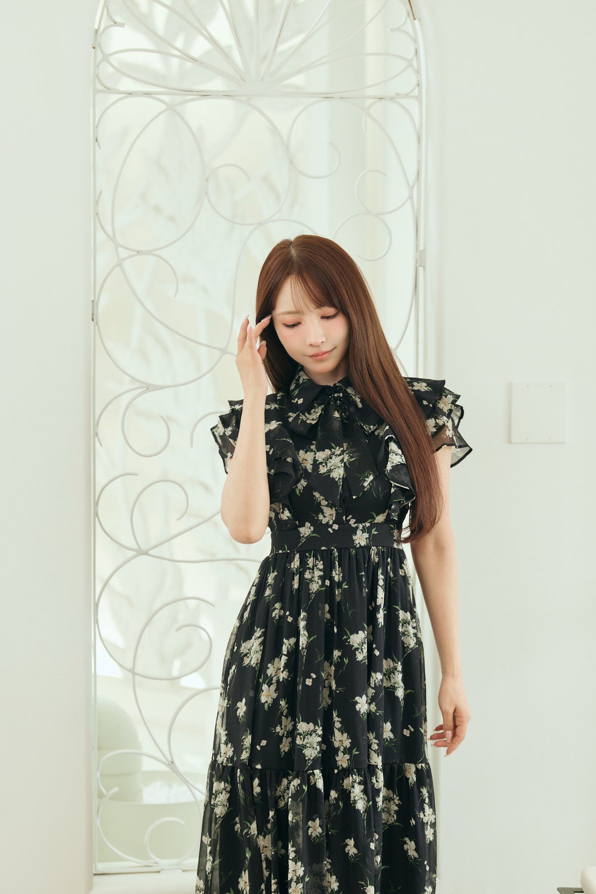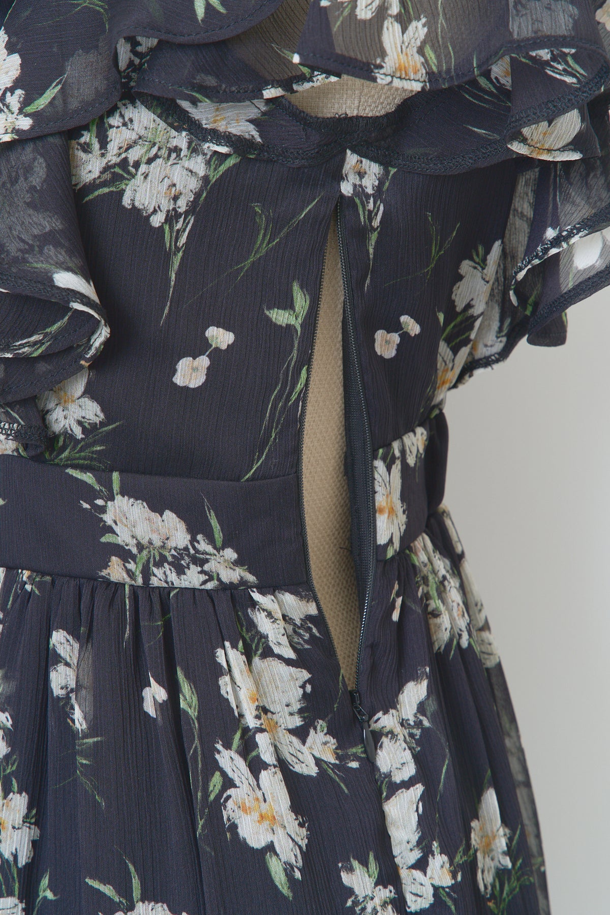 毎年人気のベルト付きのフラワードレス。今年は透け感のある楊柳素材でご用意しました。二の腕をカバーしてくれるフリルスリーブと取り外し可能なベルトでウエストマークし、スタイルアップも叶います。肌馴染みの良いベージュ、柔らかな雰囲気のブルー、白いお花が目立つ定番のブラックの三色展開です。