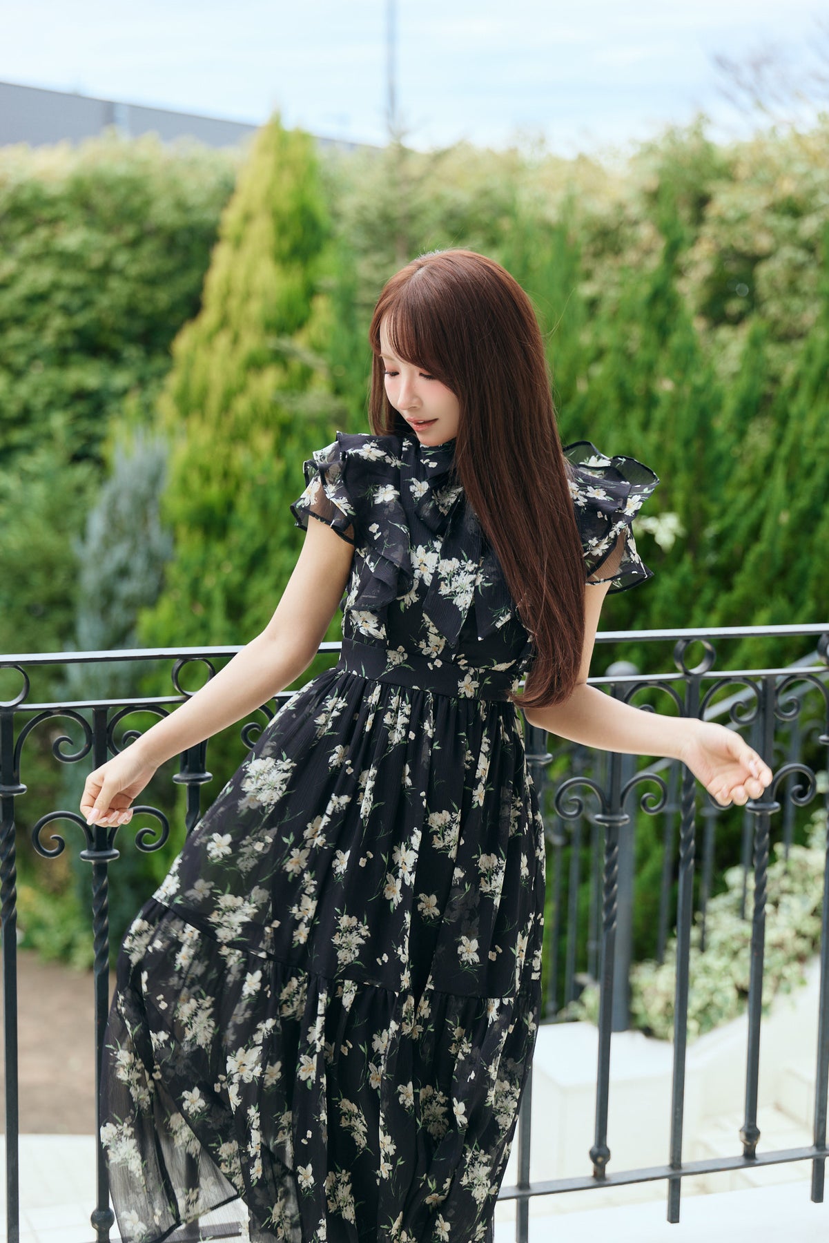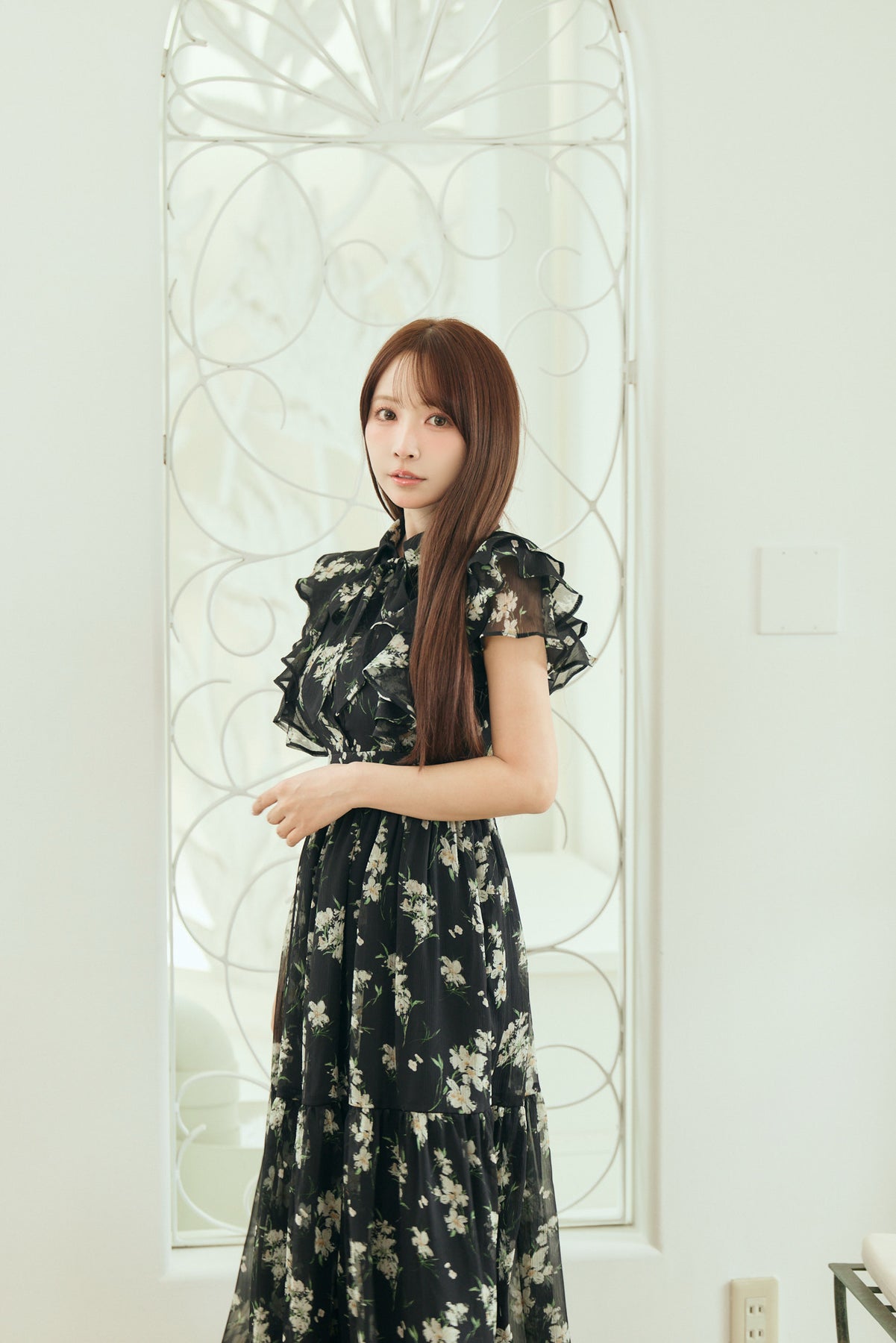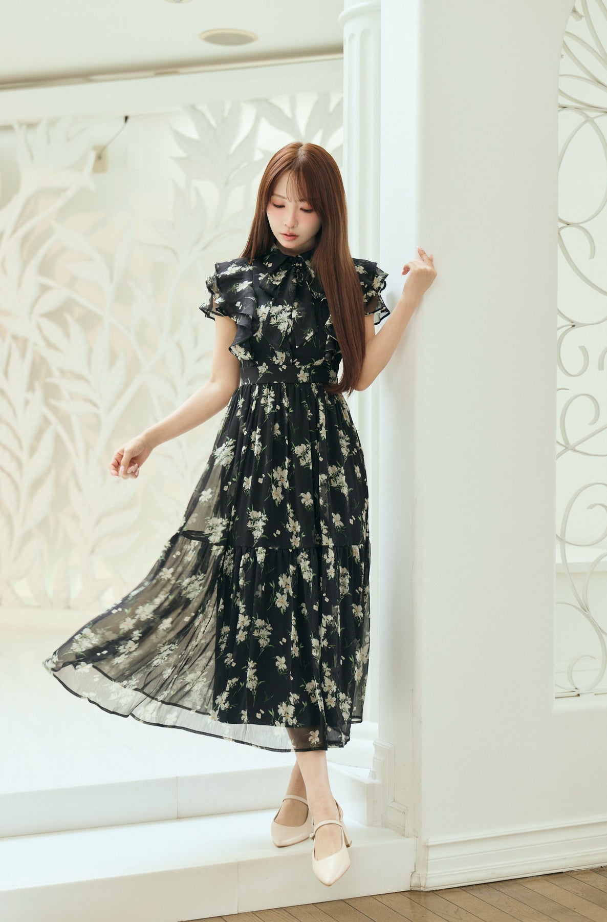 毎年人気のベルト付きのフラワードレス。今年は透け感のある楊柳素材でご用意しました。二の腕をカバーしてくれるフリルスリーブと取り外し可能なベルトでウエストマークし、スタイルアップも叶います。肌馴染みの良いベージュ、柔らかな雰囲気のブルー、白いお花が目立つ定番のブラックの三色展開です。