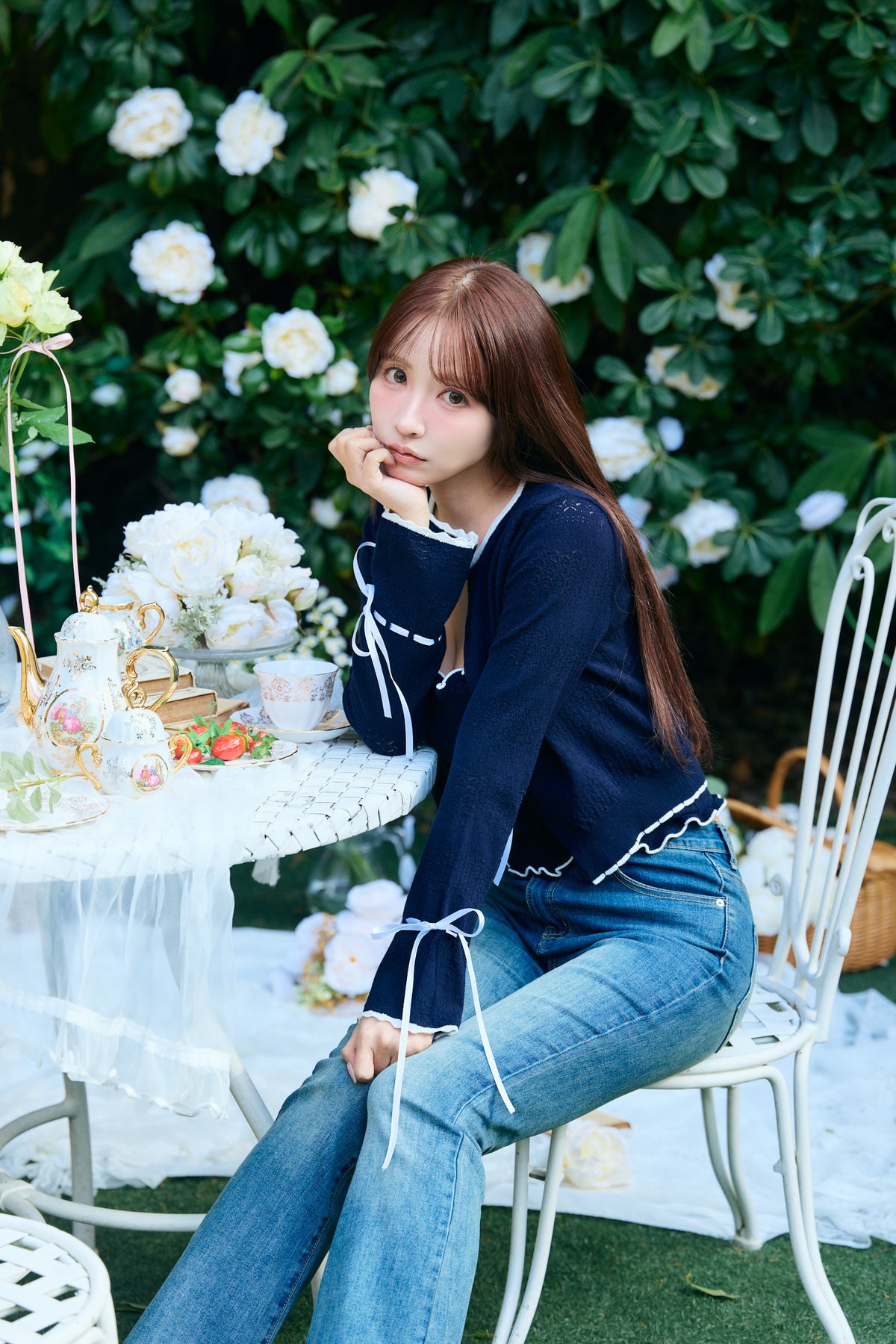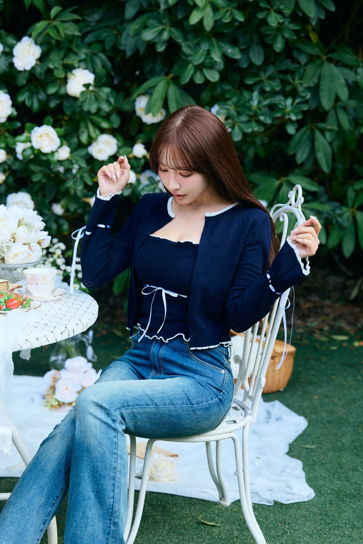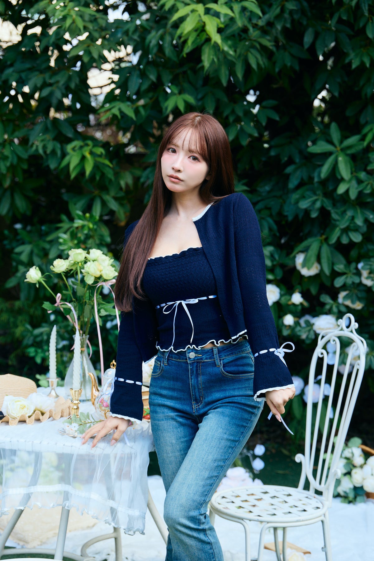 さまざまな編み柄を組み合わせた、透かし編みニットのアンサンブル。立体感のある編み地が、軽やかさと奥行きを演出してくれます。バスト下と袖口にあしらったリボンがトレンド感をプラスしつつ、全体は繊細な編みで上品な印象に。セットでの着用はもちろん、それぞれ単品でも使いやすく、どんなボトムともバランスよく決まるアイテムです。