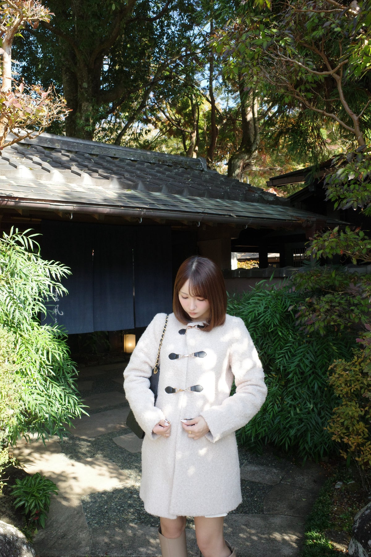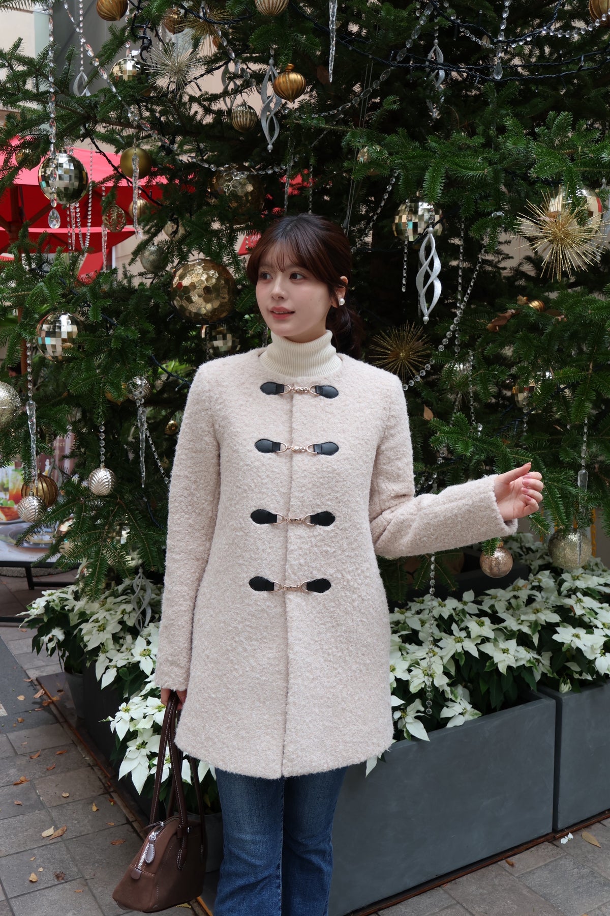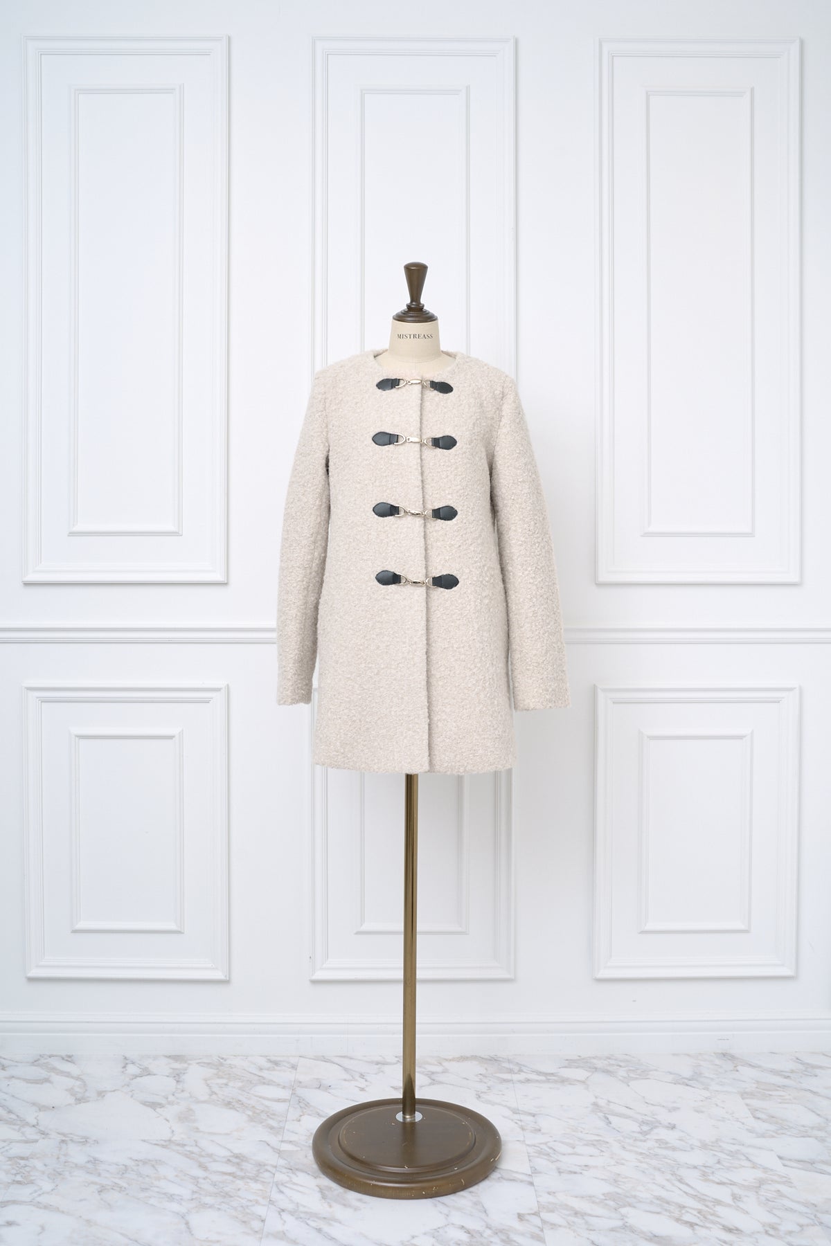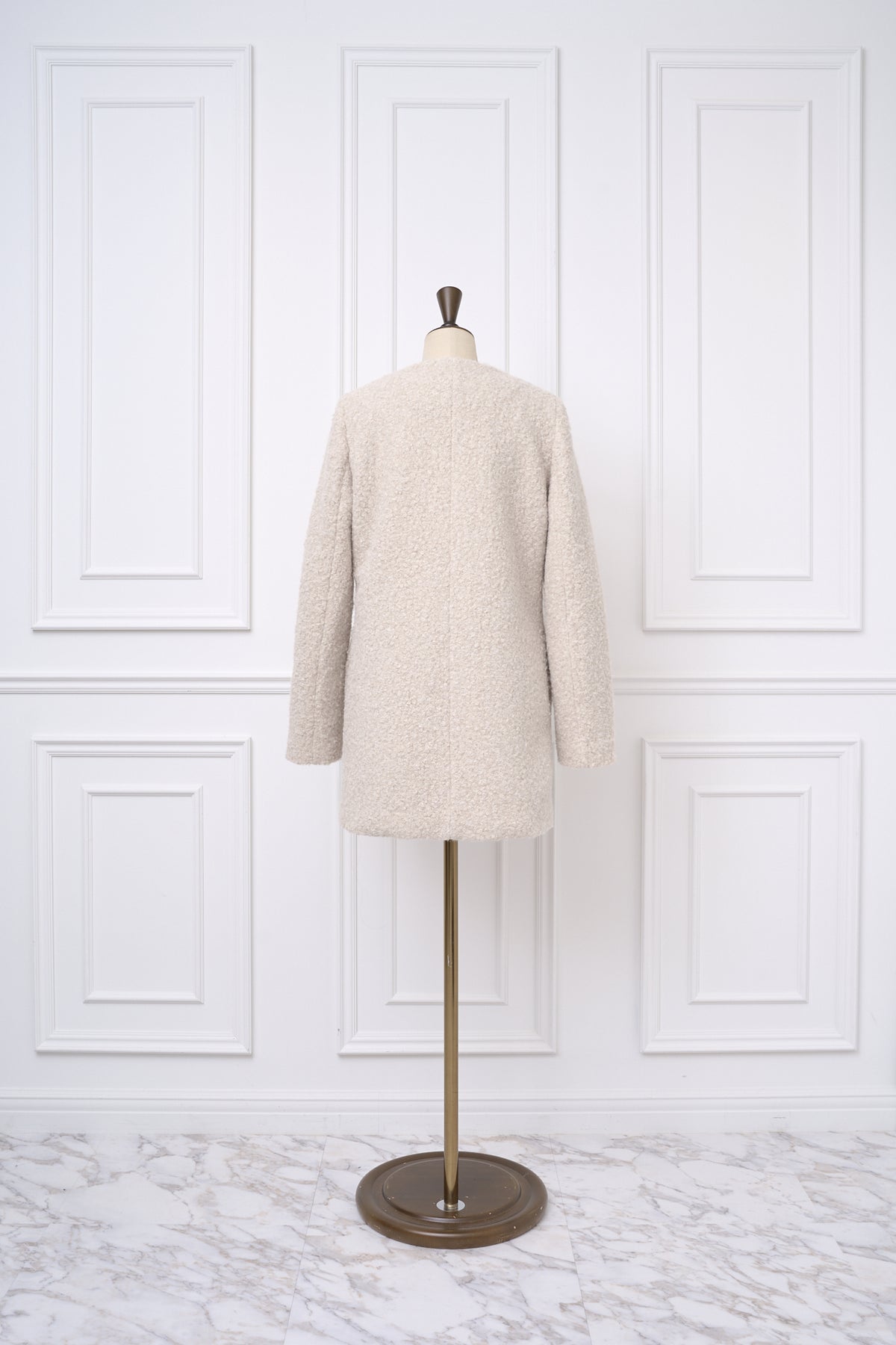ふっくらとしたブークレ素材で仕立てた、上品なノーカラーコート。