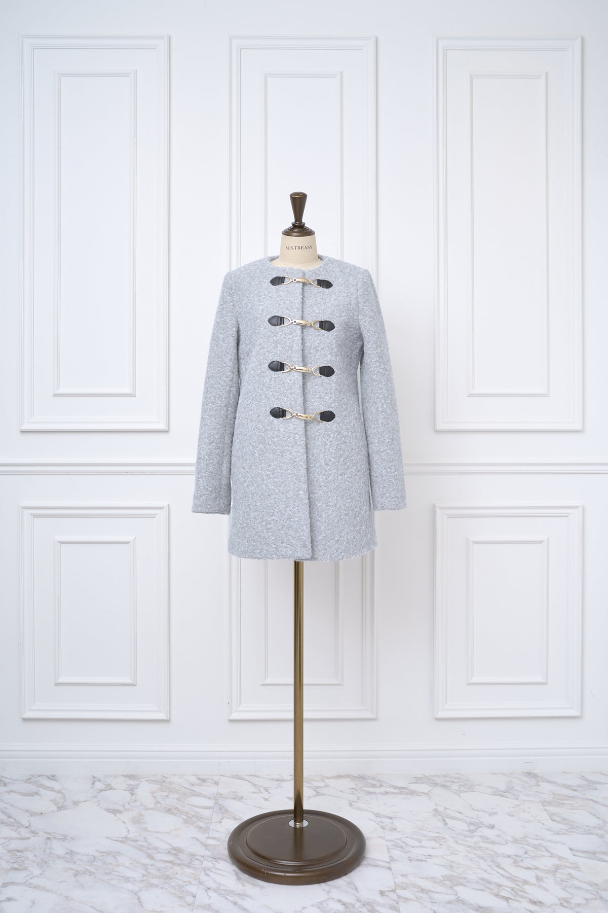 顔まわりをすっきり見せるノーカラーデザインと、ウエストラインを美しく引き立てるシルエットが魅力。