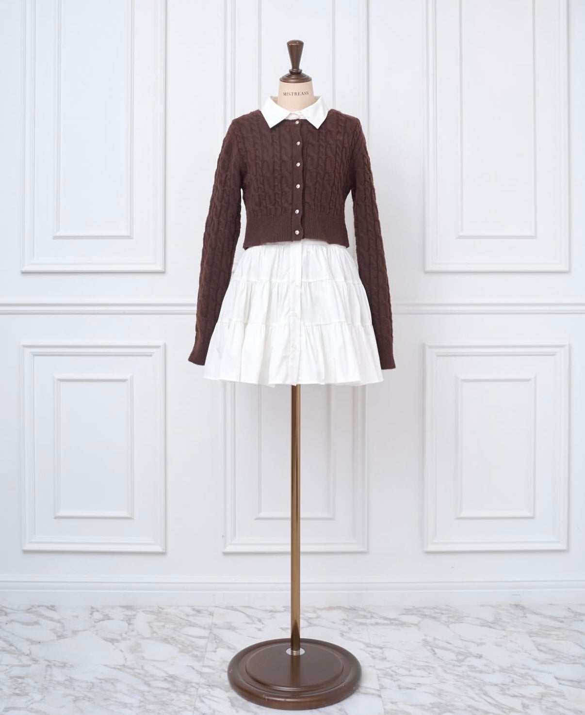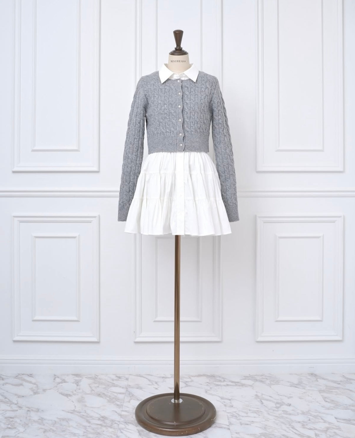 ケーブルニットカーディガンとシャツミニワンピースのセットアイテム。