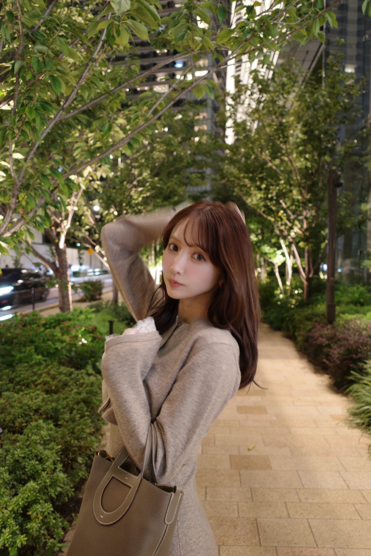 キャミソール型ワンピースとカーディガンをセットにしたアンサンブルです。ワンピースの裾やカーディガンの袖から覗くレースがミストレアスらしい特別感を演出してくれます。ニットには珍しいインナーキャミ付きなのも嬉しいポイント。ワンピースはデコルテ部分をしっかり開けて、カーディガンを羽織った時に女性らしい印象になるようにお作りしています。ヒップまではすっきりとさせていますが、裾幅をしっかりと出したシルエットも女性らしく、クロップド丈のカーディガンでウエスト位置が強調されるのもスタイルアップして魅せてくれるポイントです。