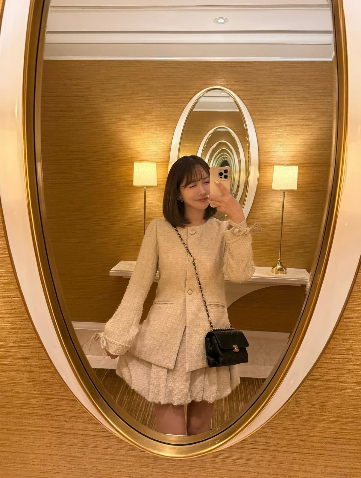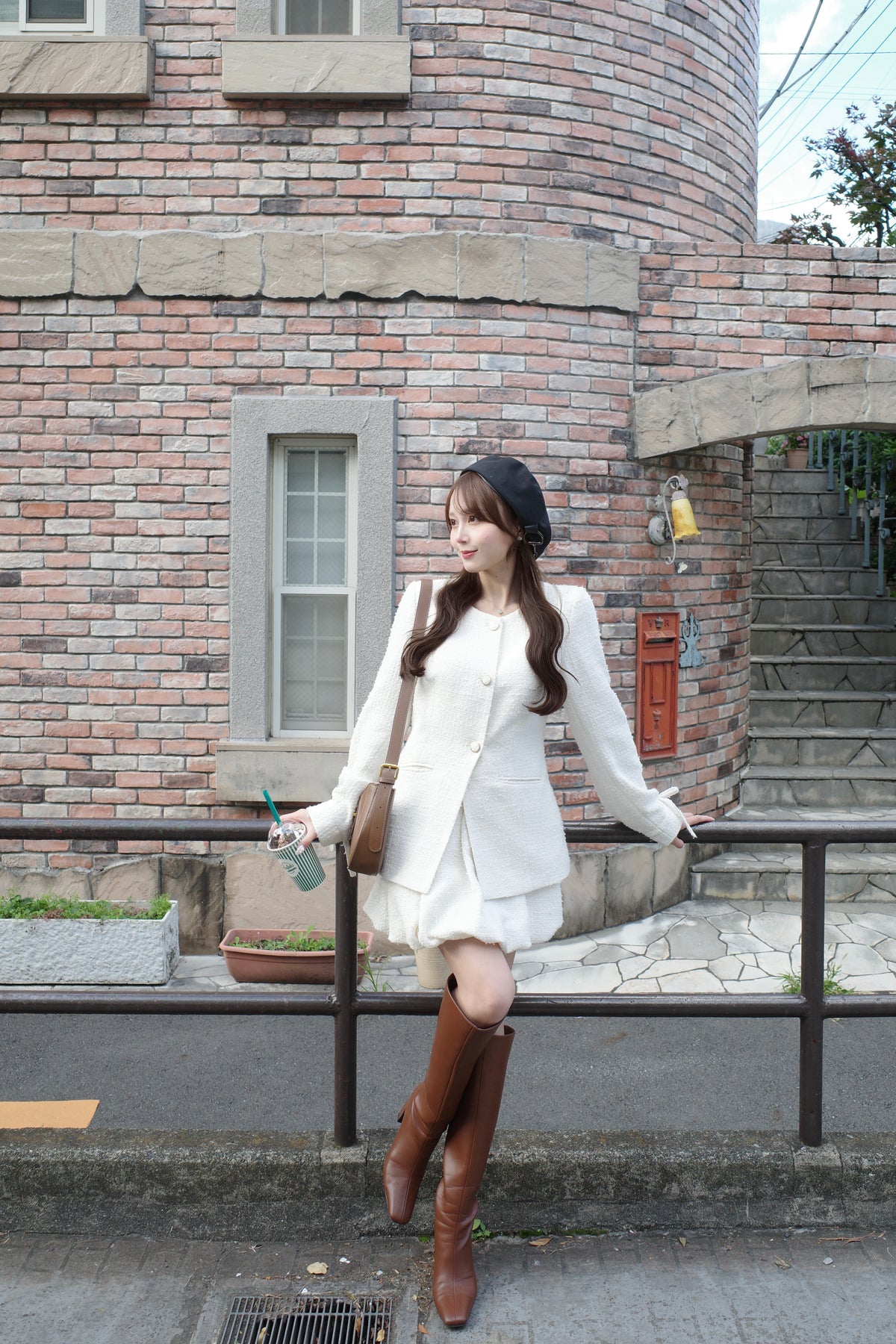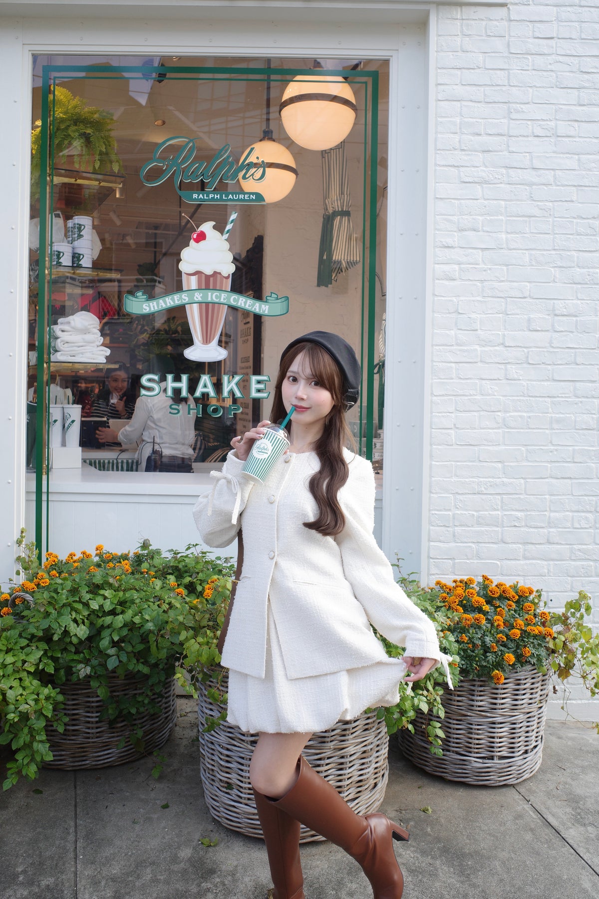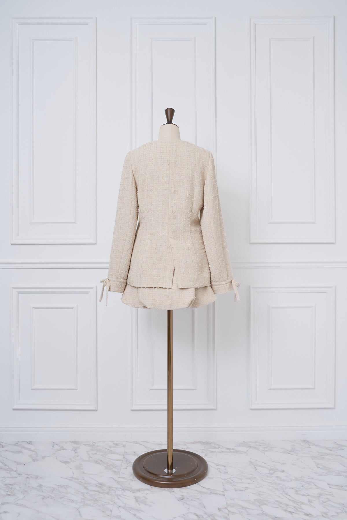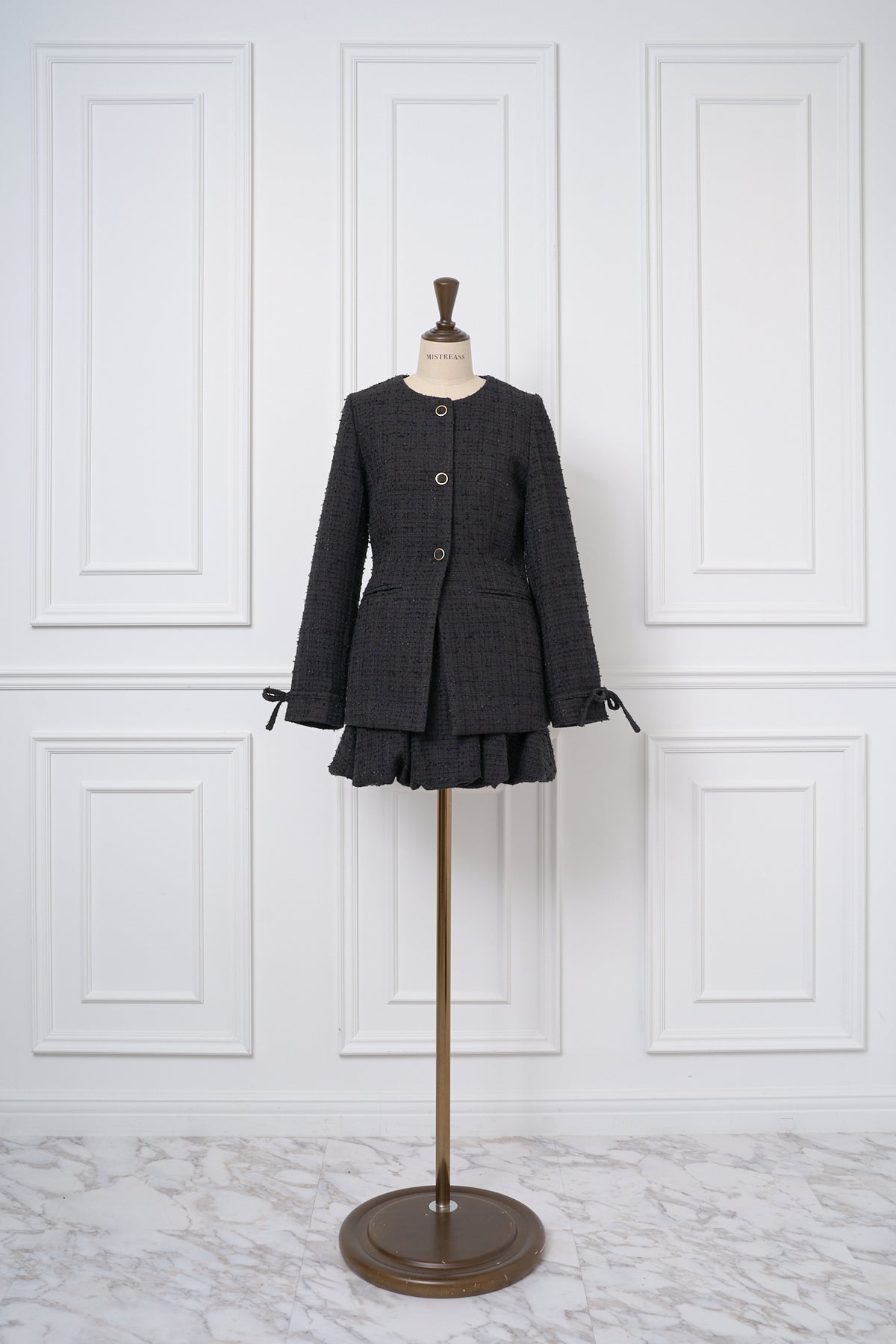 ウエストシェイプされたクラシックなシルエットが特徴のジャケットと、バルーンシルエットが脚を綺麗に見せてくれるスカートのセットアップ。ジャケットはくびれをつけ、ボタンをウエストまでにしたことで裾が開くので、腰回りもカバーされ、セットのバルーンスカートはもちろんデニムなどを合わせてもスタイルアップして魅せてくれます◎袖口のリボンでミストレアスらしいフェミニンさをプラスしました。