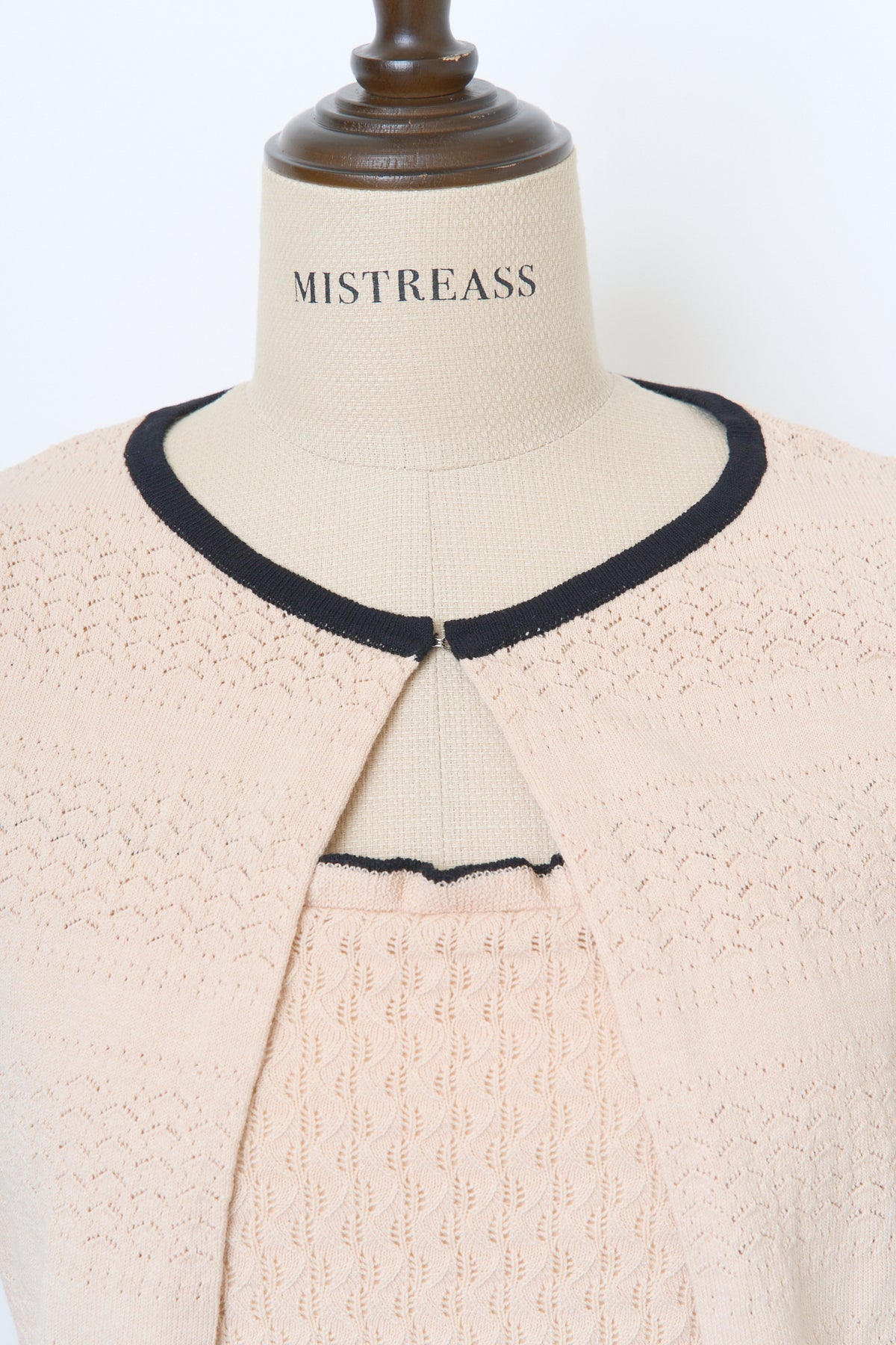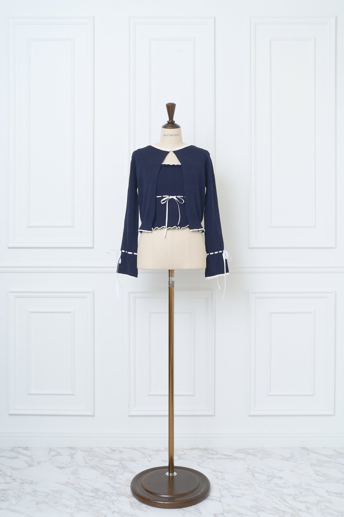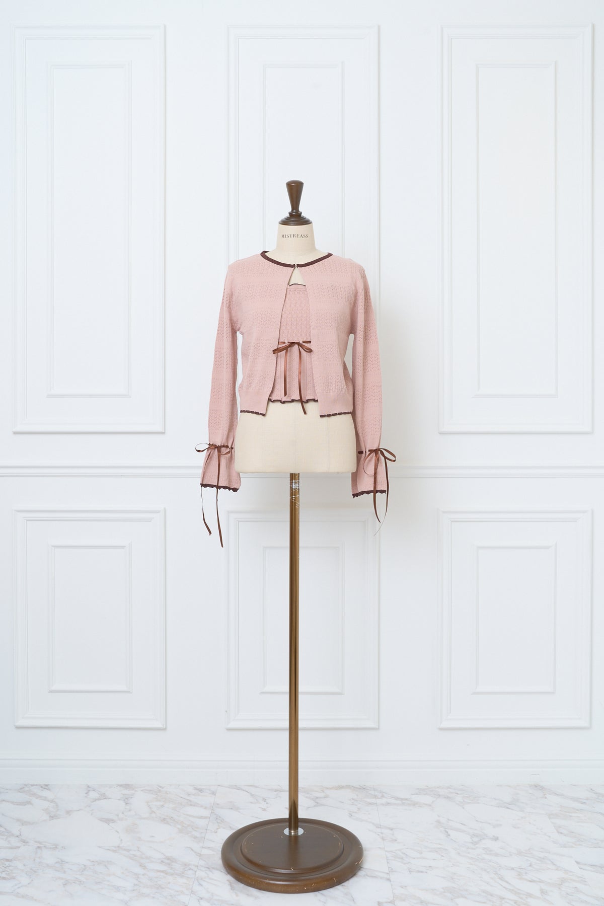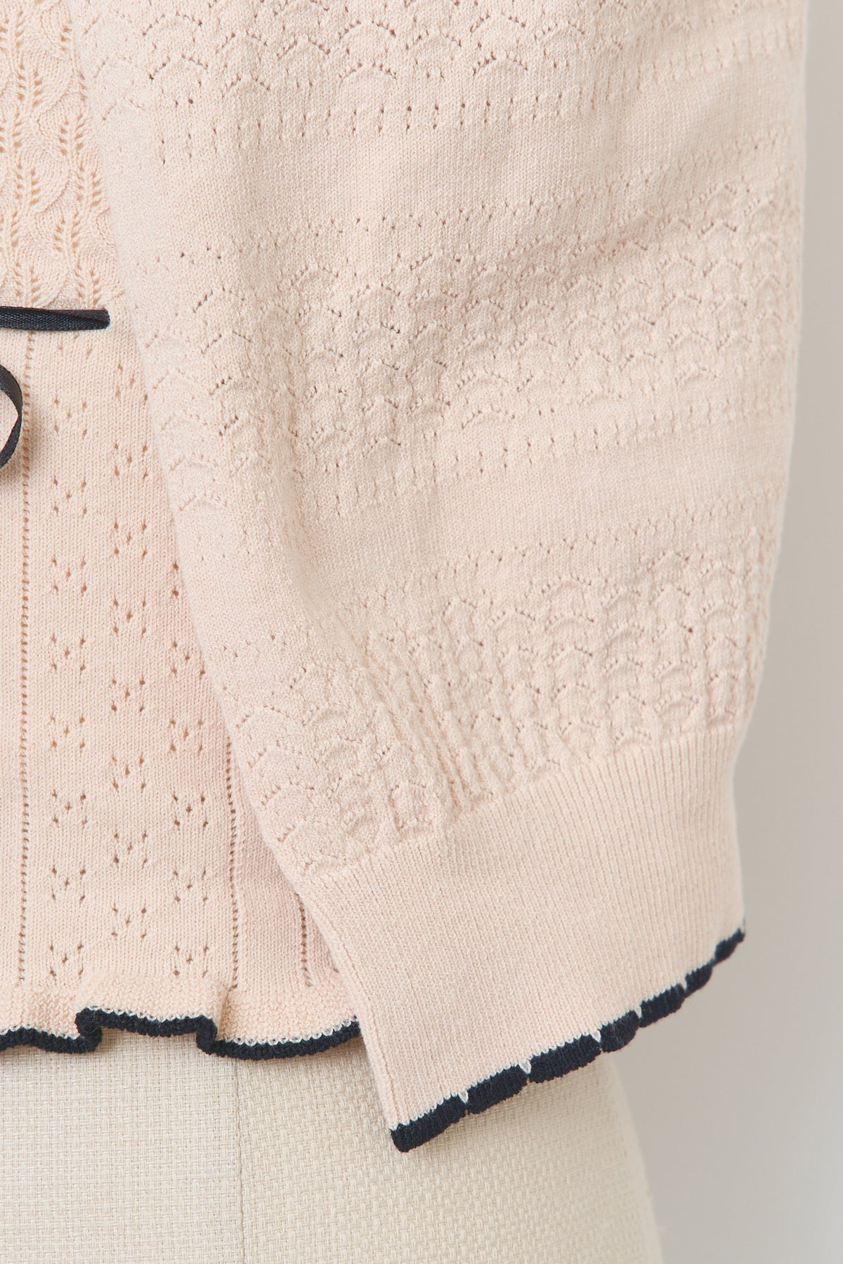 さまざまな編み柄を組み合わせた、透かし編みニットのアンサンブル。立体感のある編み地が、軽やかさと奥行きを演出してくれます。バスト下と袖口にあしらったリボンがトレンド感をプラスしつつ、全体は繊細な編みで上品な印象に。セットでの着用はもちろん、それぞれ単品でも使いやすく、どんなボトムともバランスよく決まるアイテムです。