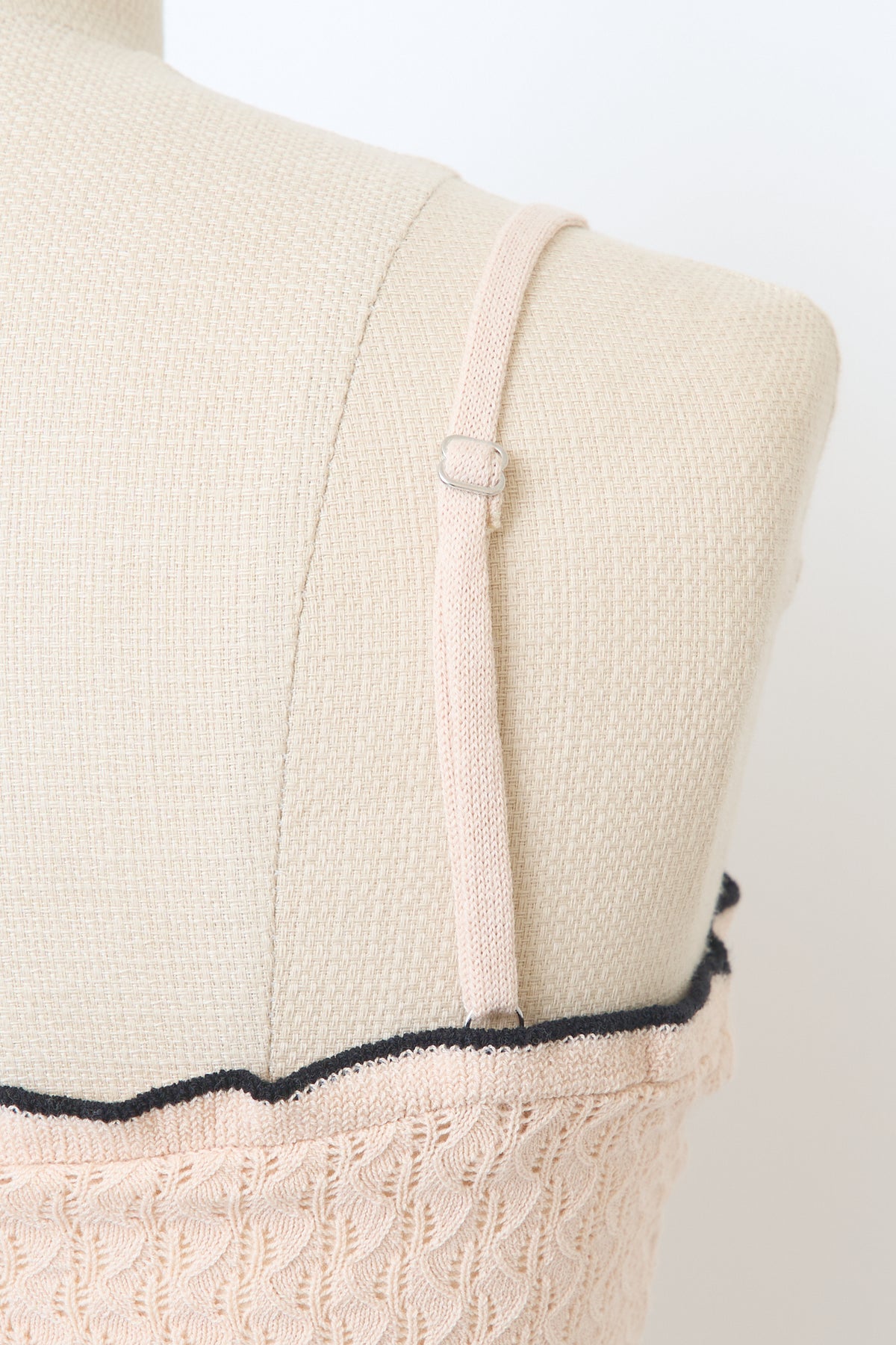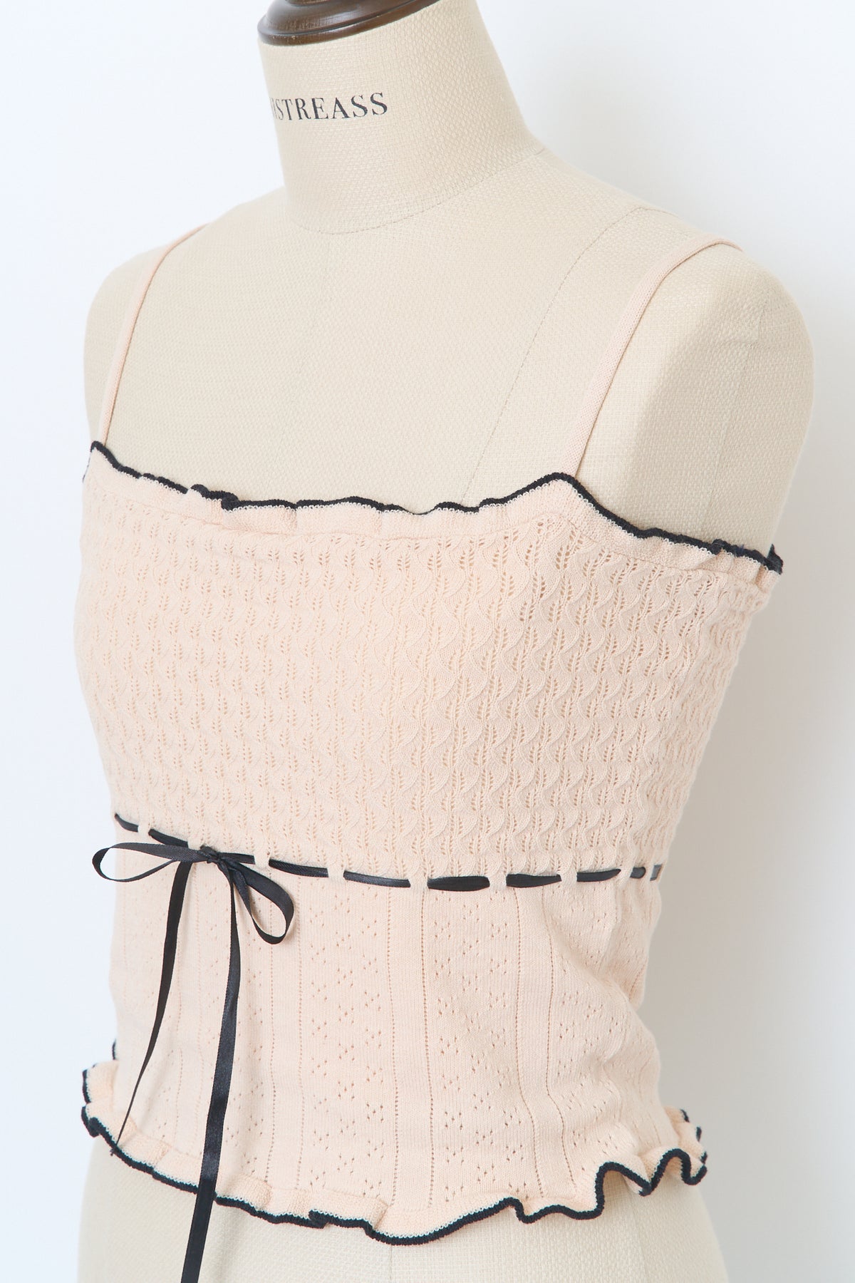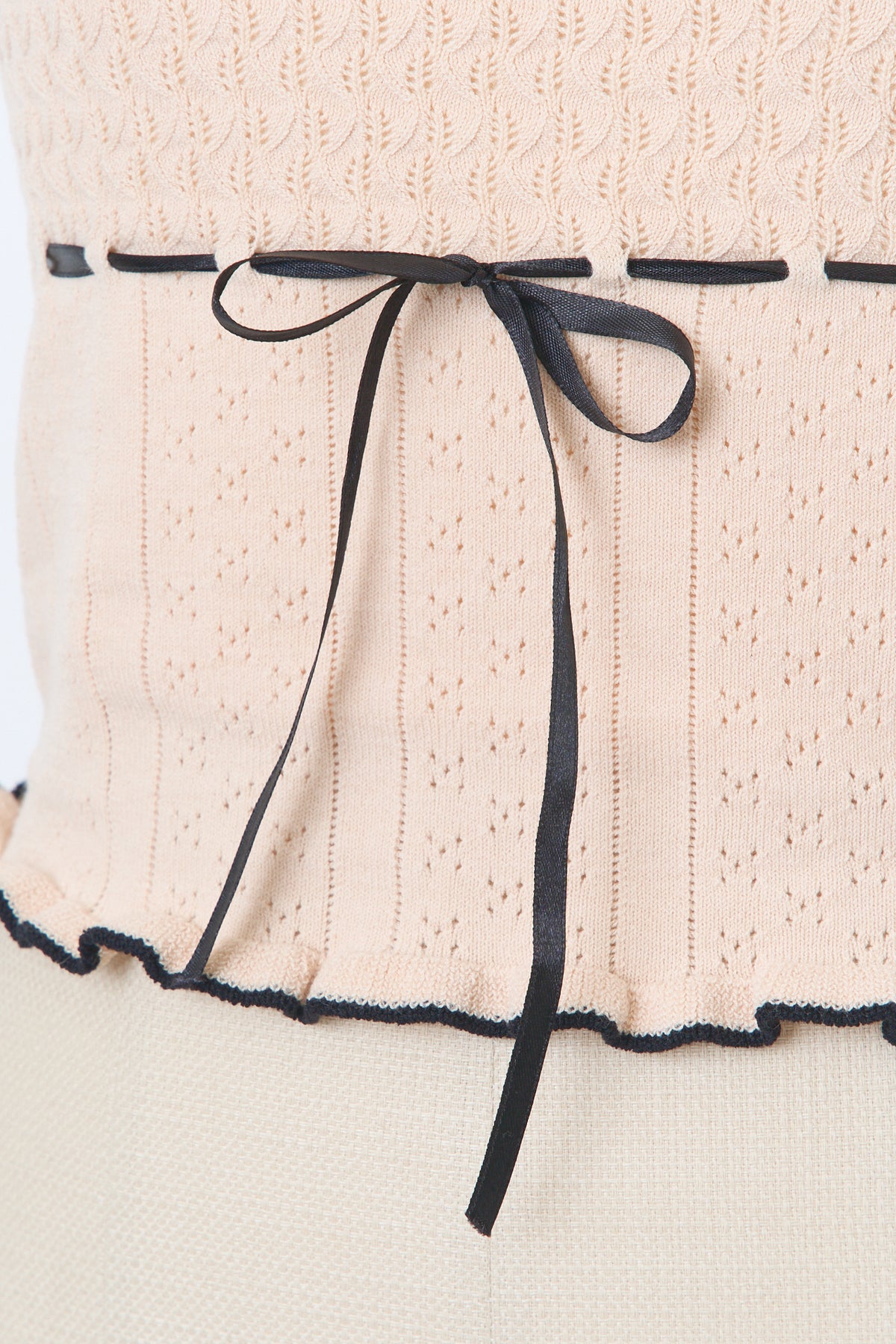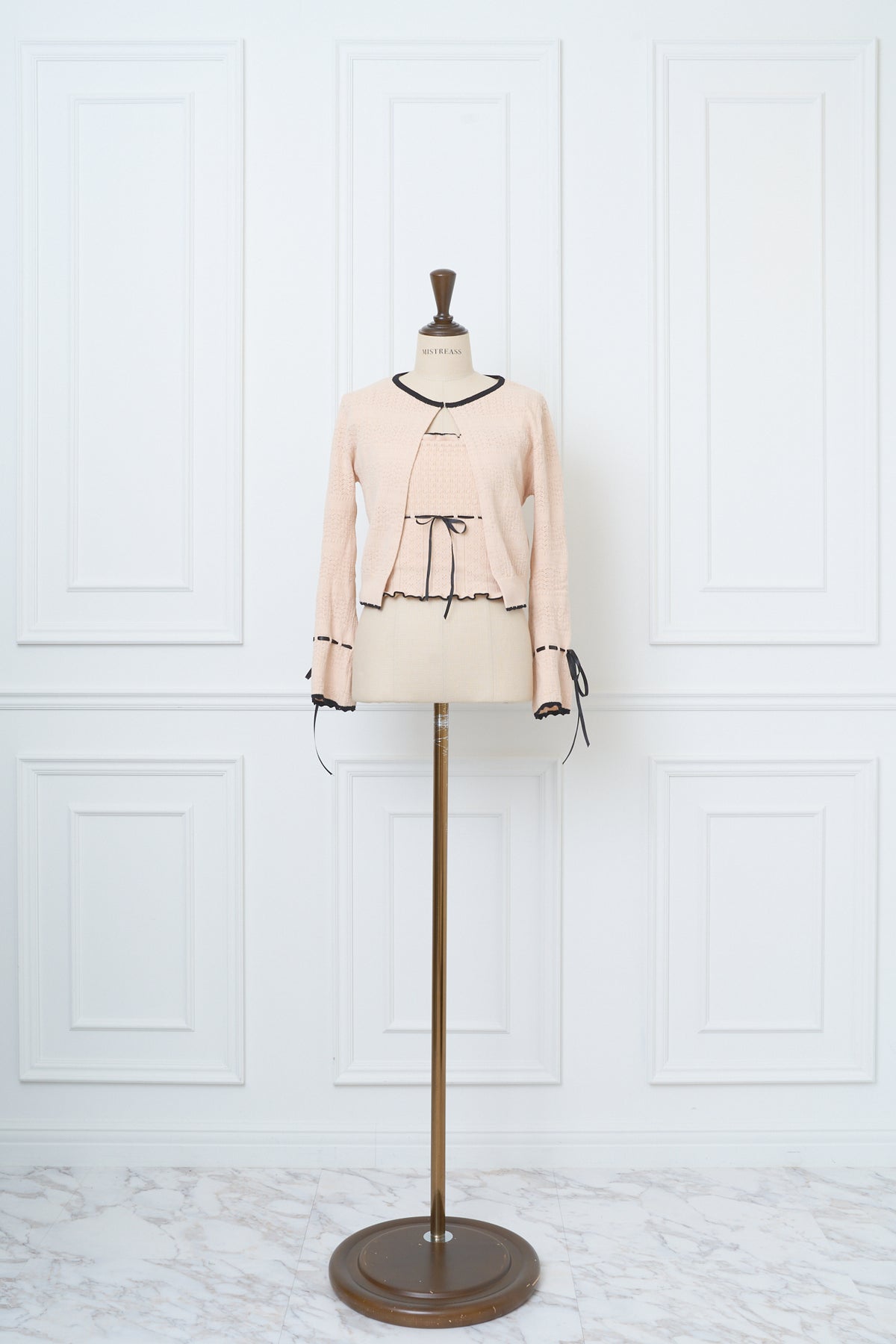 さまざまな編み柄を組み合わせた、透かし編みニットのアンサンブル。立体感のある編み地が、軽やかさと奥行きを演出してくれます。バスト下と袖口にあしらったリボンがトレンド感をプラスしつつ、全体は繊細な編みで上品な印象に。セットでの着用はもちろん、それぞれ単品でも使いやすく、どんなボトムともバランスよく決まるアイテムです。