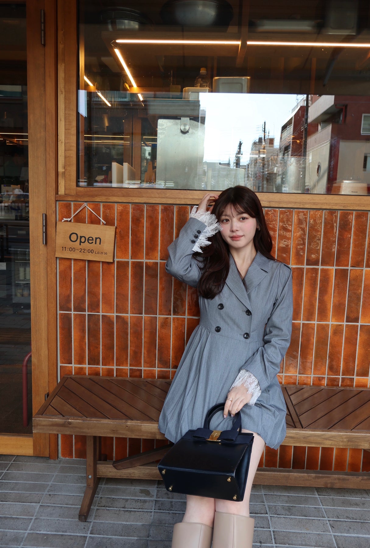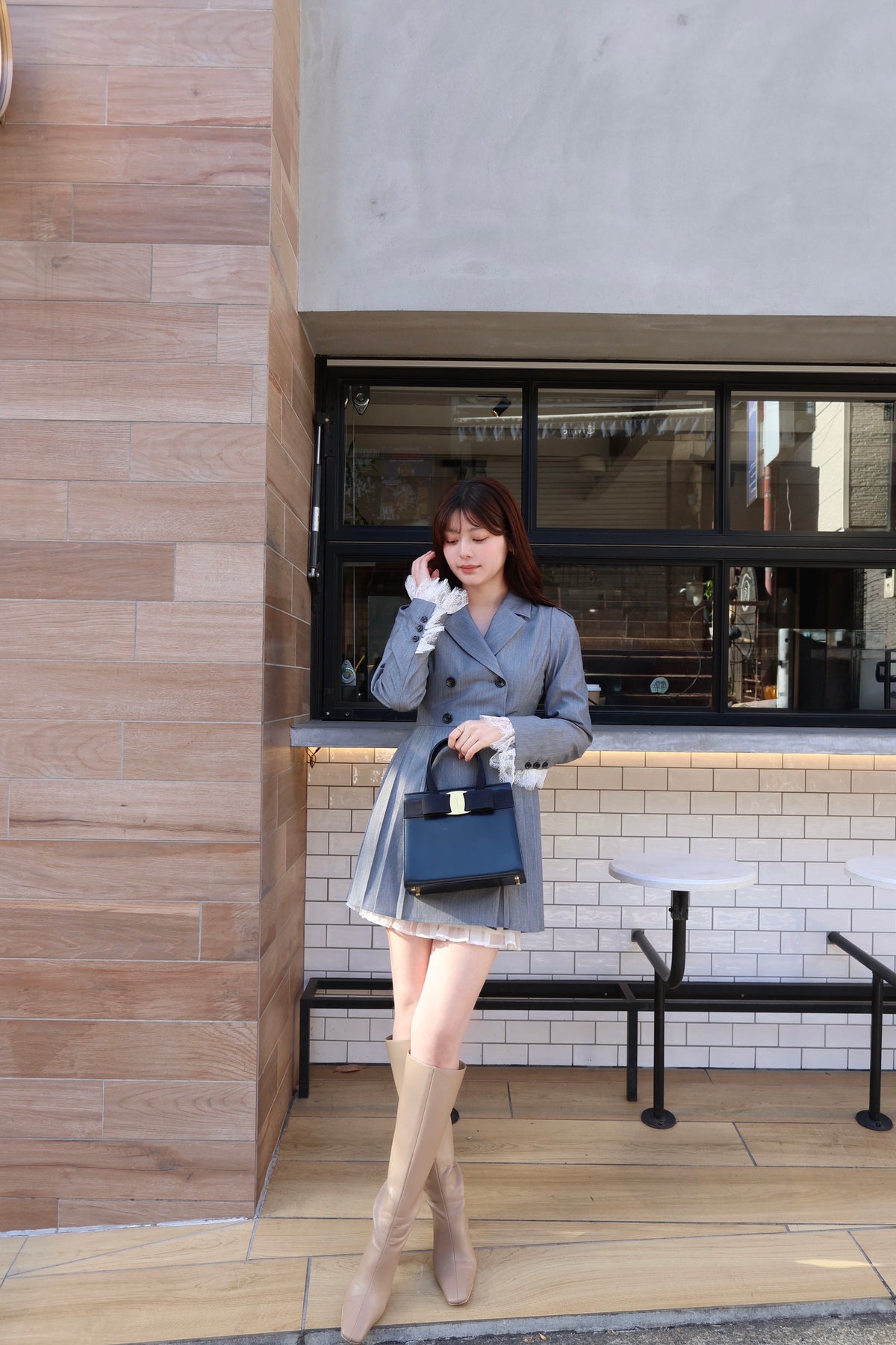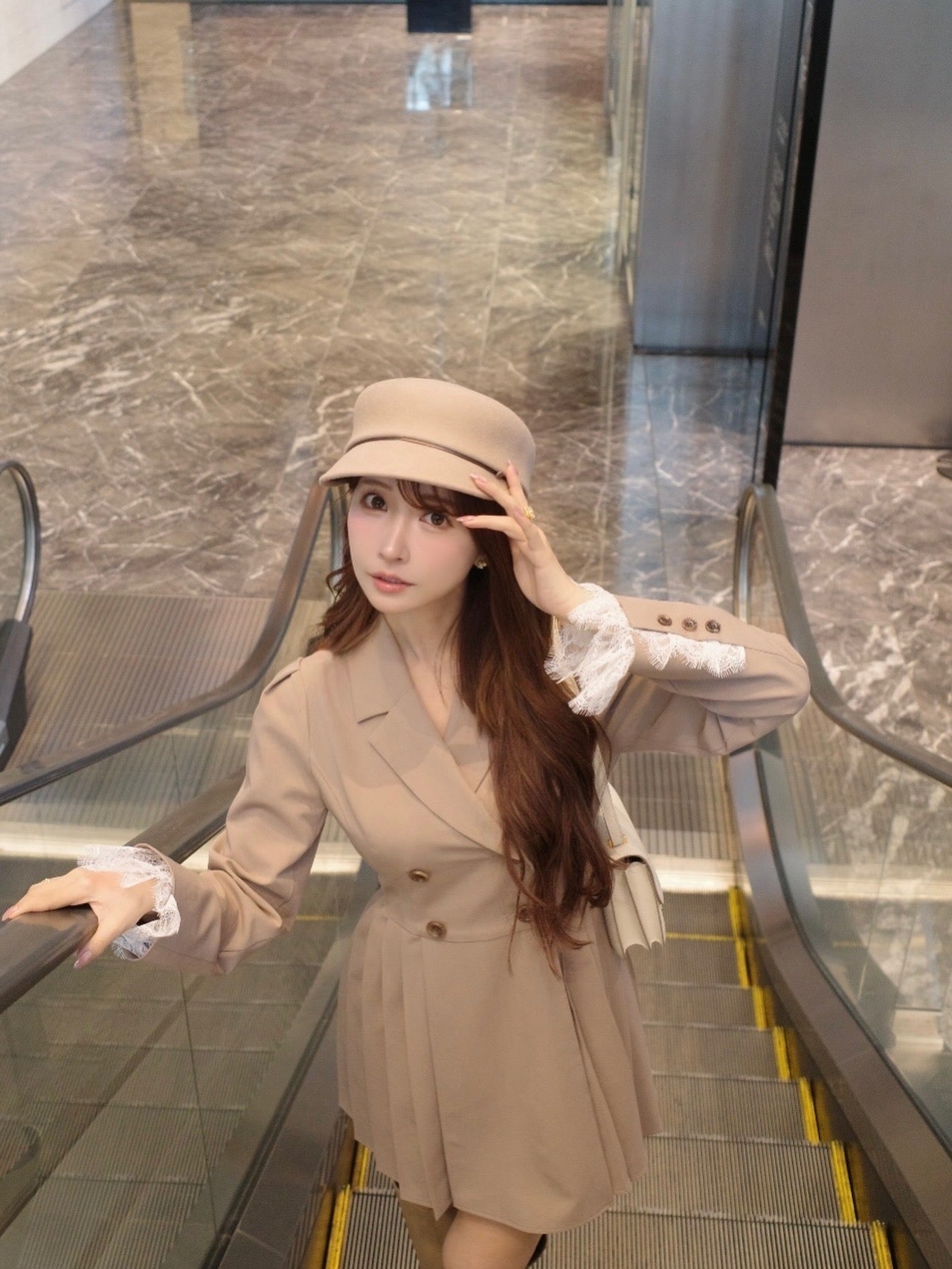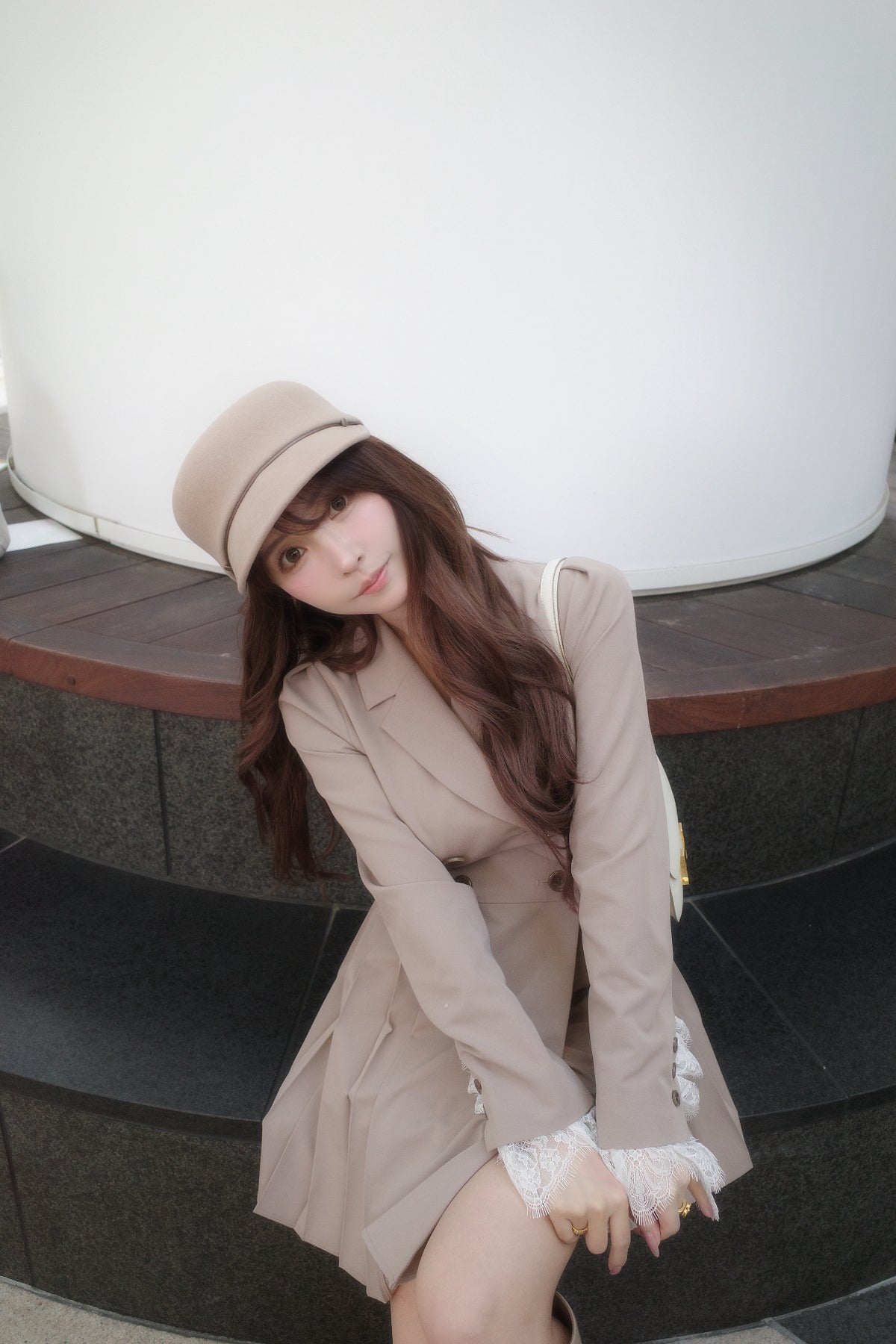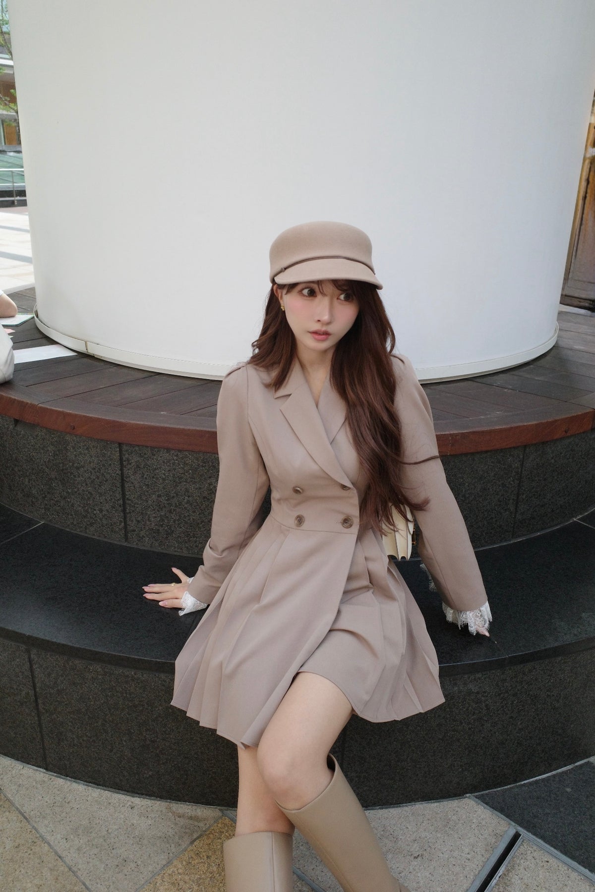 軽やかなTR素材で仕立てた、ジャケット見えワンピース。ウエスト位置を高めに設定したプリーツスカートで、自然にスタイルアップが叶うシルエットに。ダブルボタンできちんと感を出しつつ、袖口のレースカフスが今年らしい特別感を演出してくれます。1枚でさらっと着るだけで、上品さと可愛さのバランスが完成する一着です。