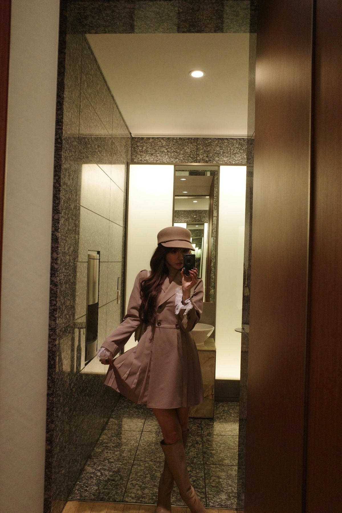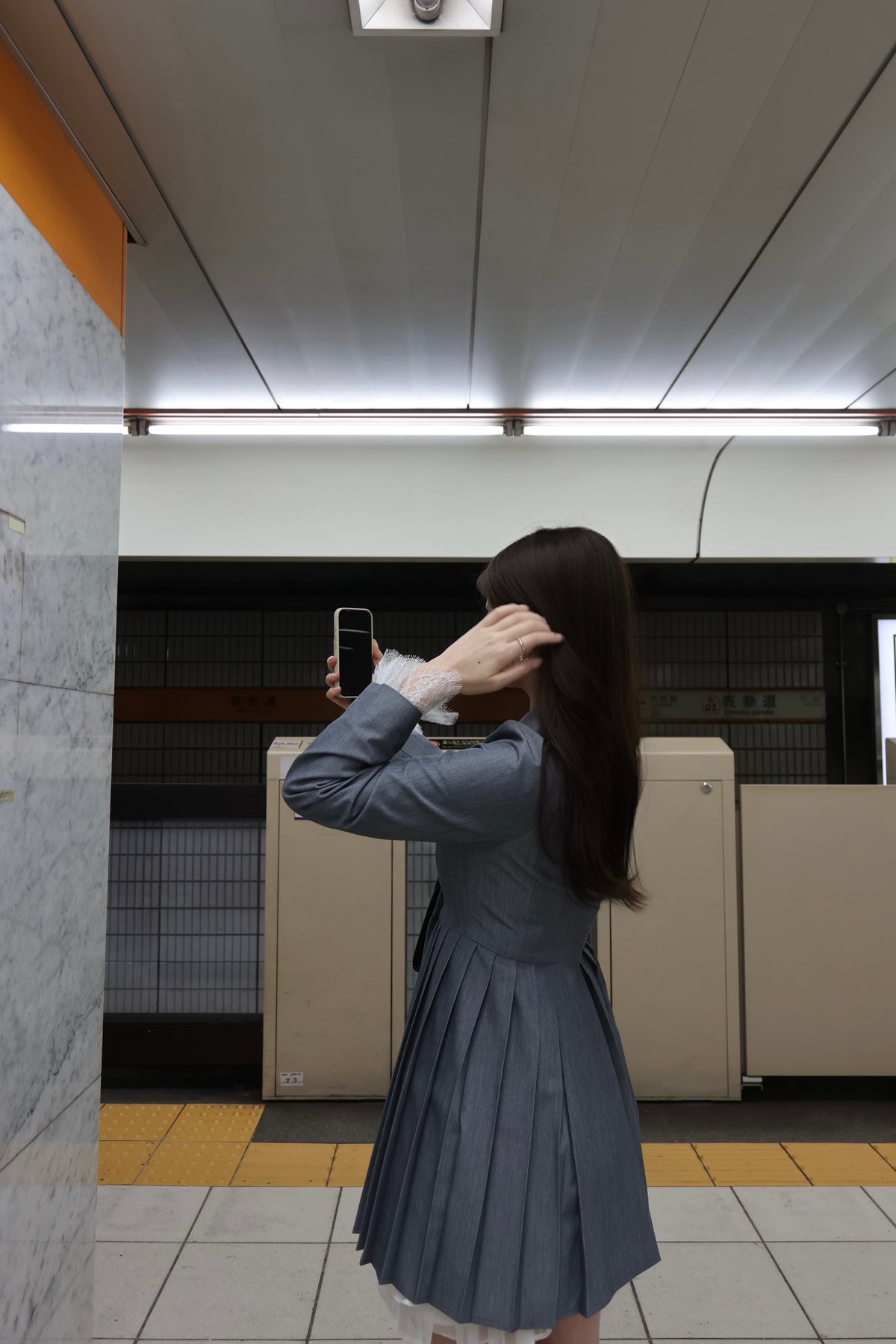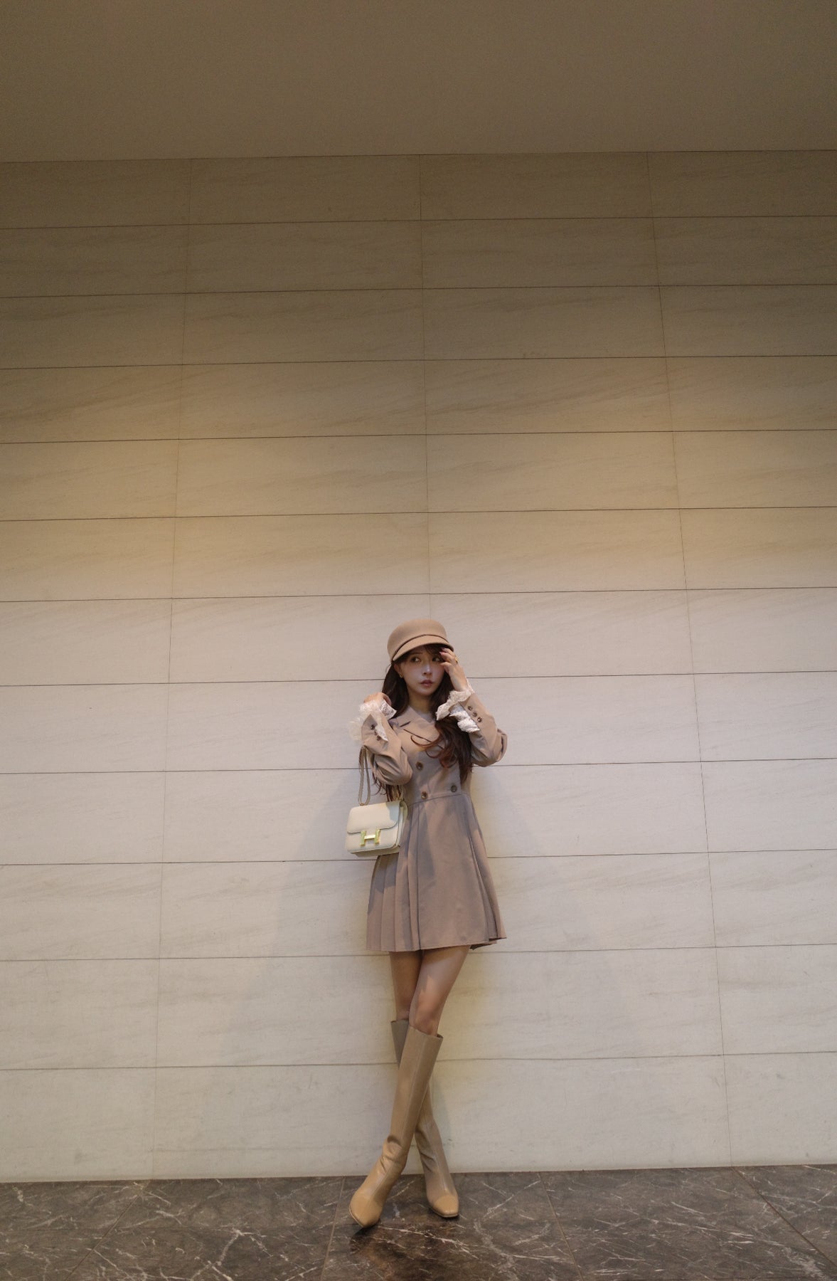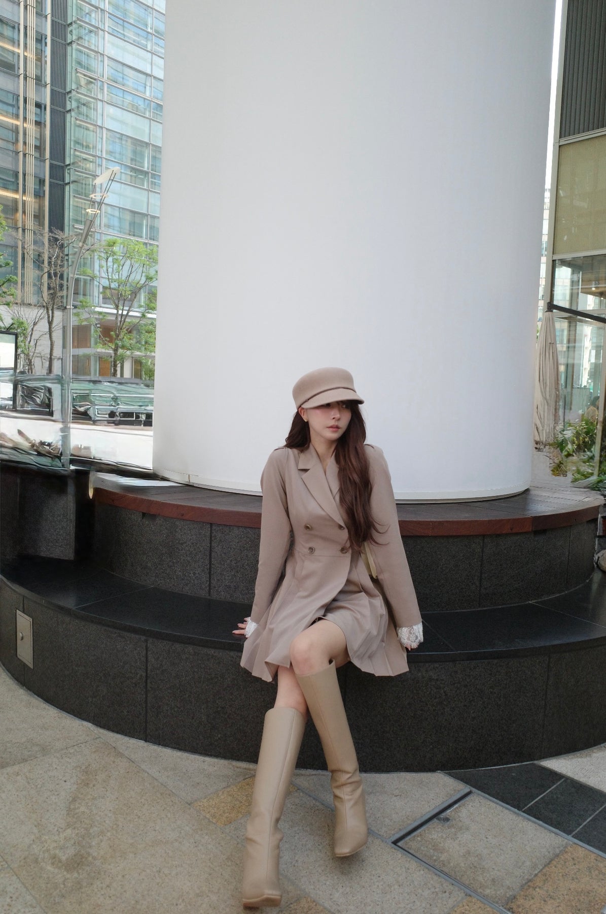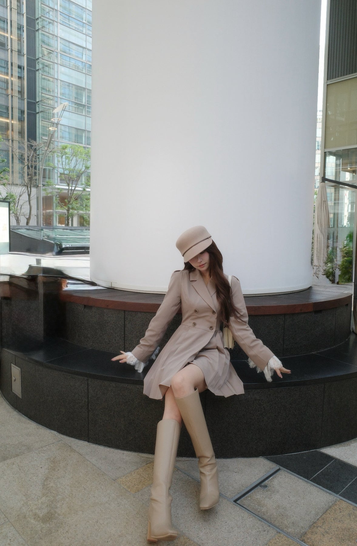 軽やかなTR素材で仕立てた、ジャケット見えワンピース。ウエスト位置を高めに設定したプリーツスカートで、自然にスタイルアップが叶うシルエットに。ダブルボタンできちんと感を出しつつ、袖口のレースカフスが今年らしい特別感を演出してくれます。1枚でさらっと着るだけで、上品さと可愛さのバランスが完成する一着です。