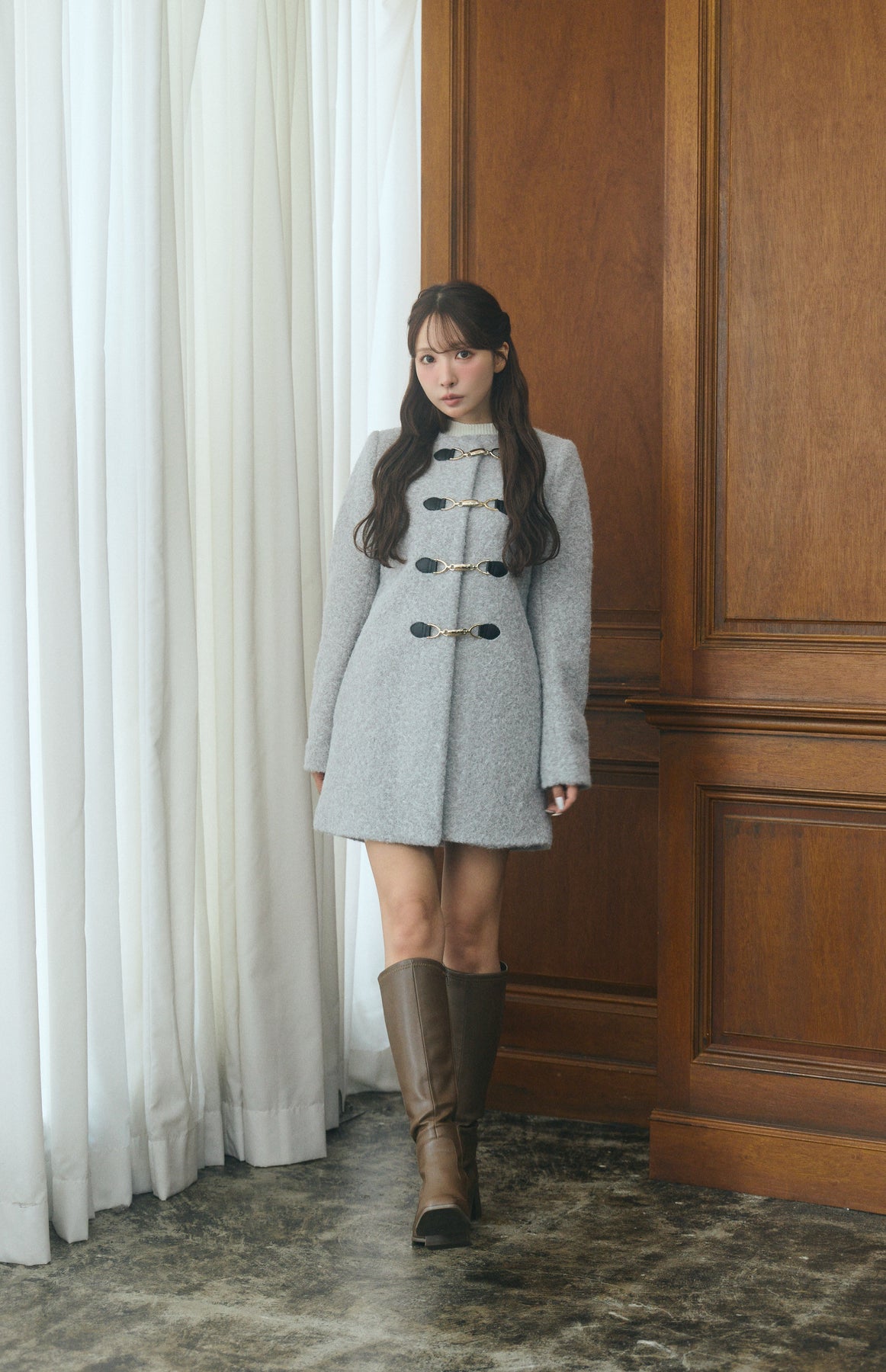 顔まわりをすっきり見せるノーカラーデザインと、ウエストラインを美しく引き立てるシルエットが魅力。