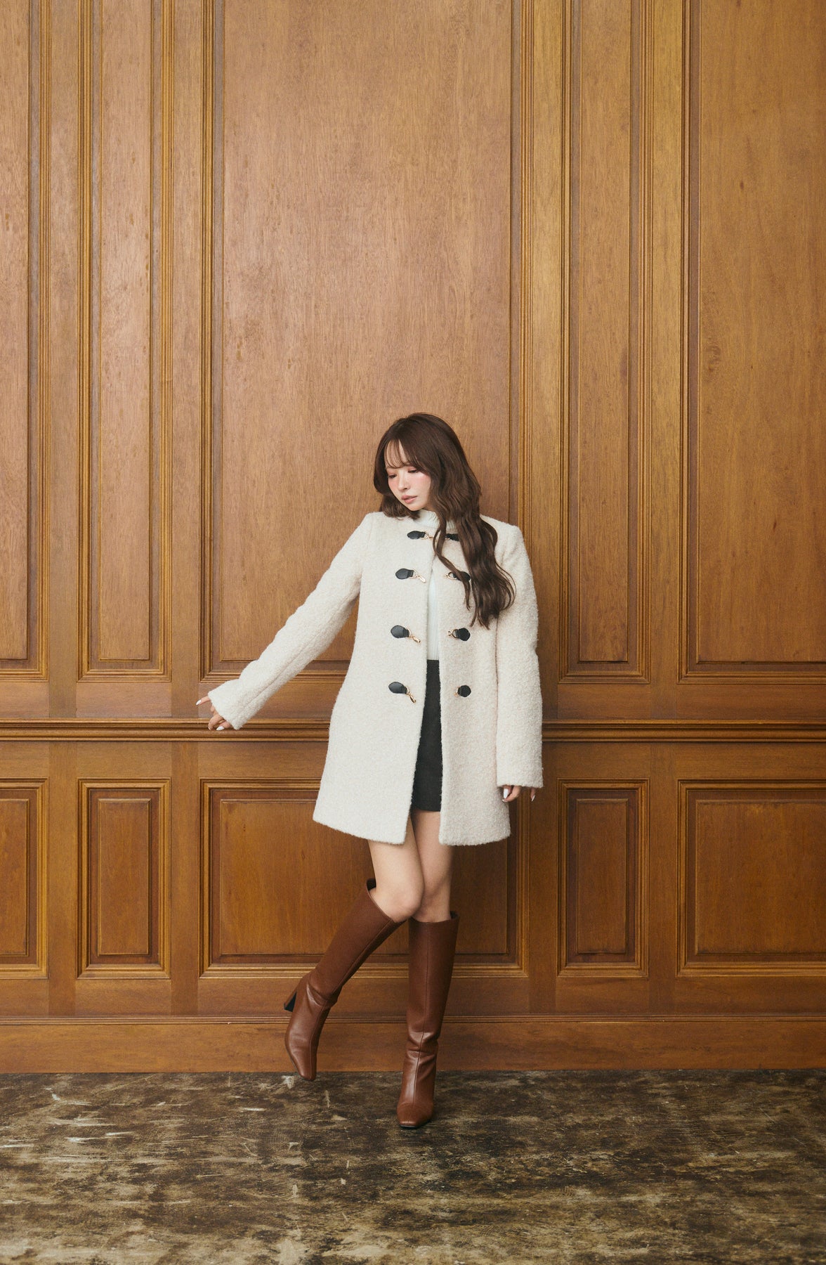 ふっくらとしたブークレ素材で仕立てた、上品なノーカラーコート。