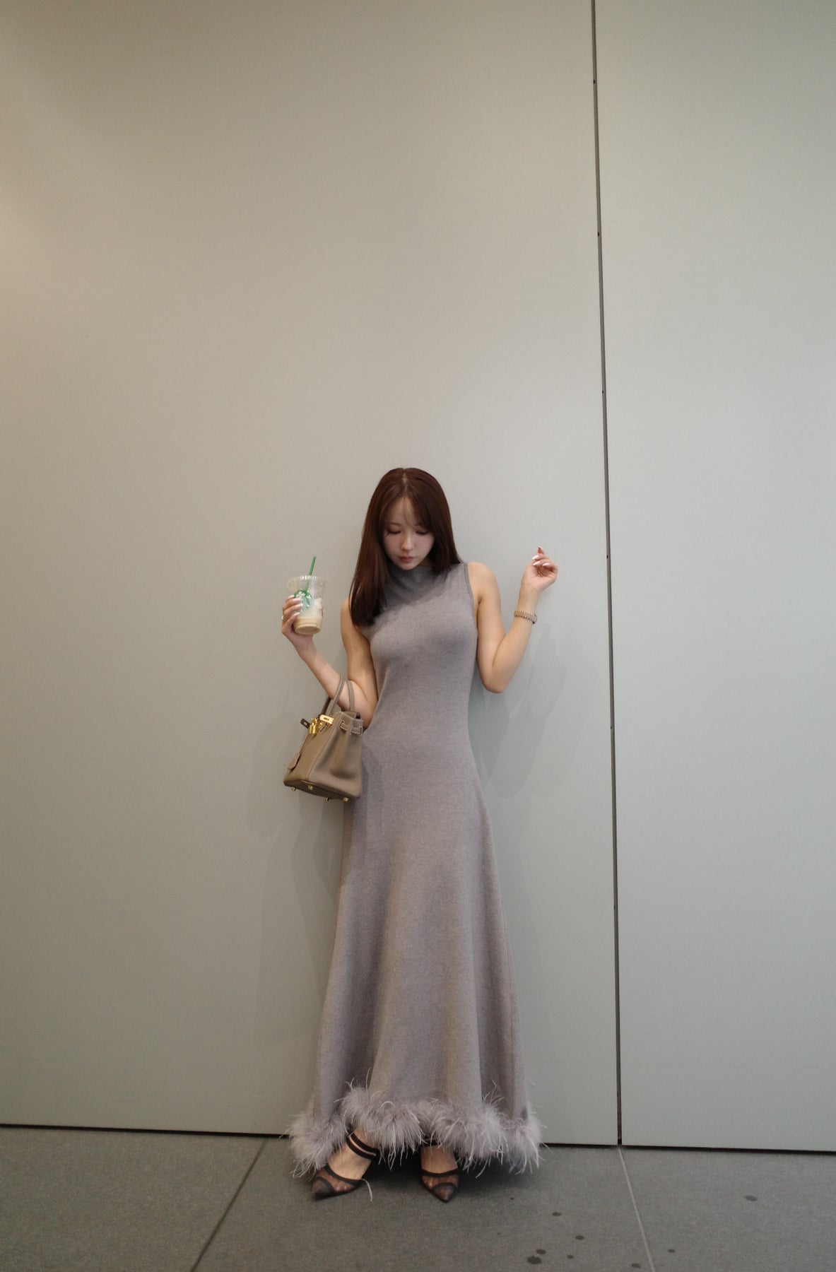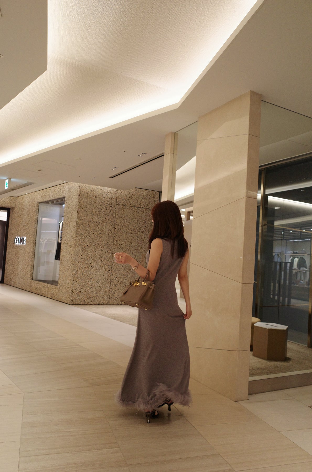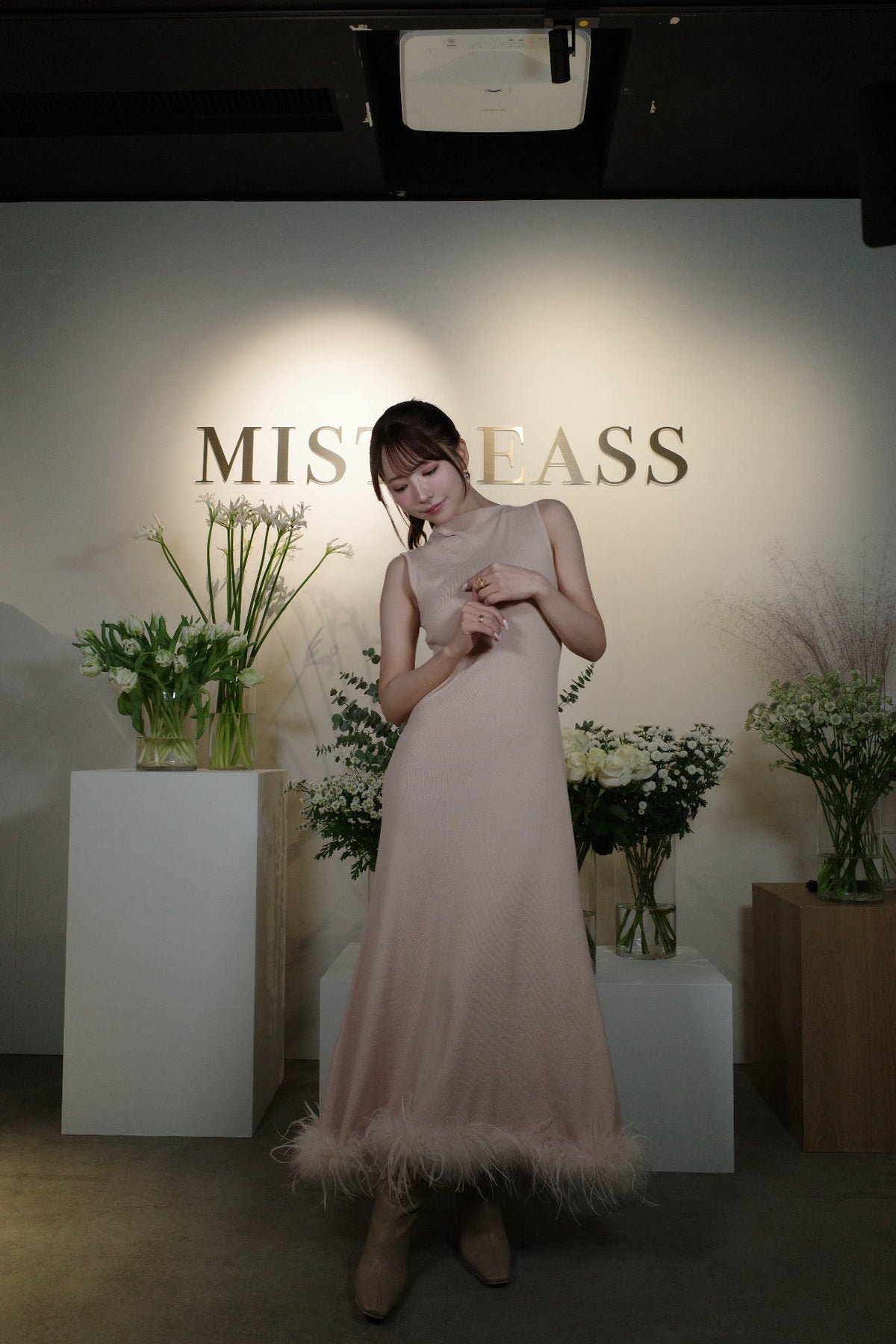 ホリデーシーズンにぴったりな上品なニットドレス。シンプルなシルエットながら、襟はアシンメトリーで抜け感のあるボトルネックで女性らしい抜け感を表現。裾にはフェザーをあしらい、ホリデーらしい煌びやかさをプラスしました。