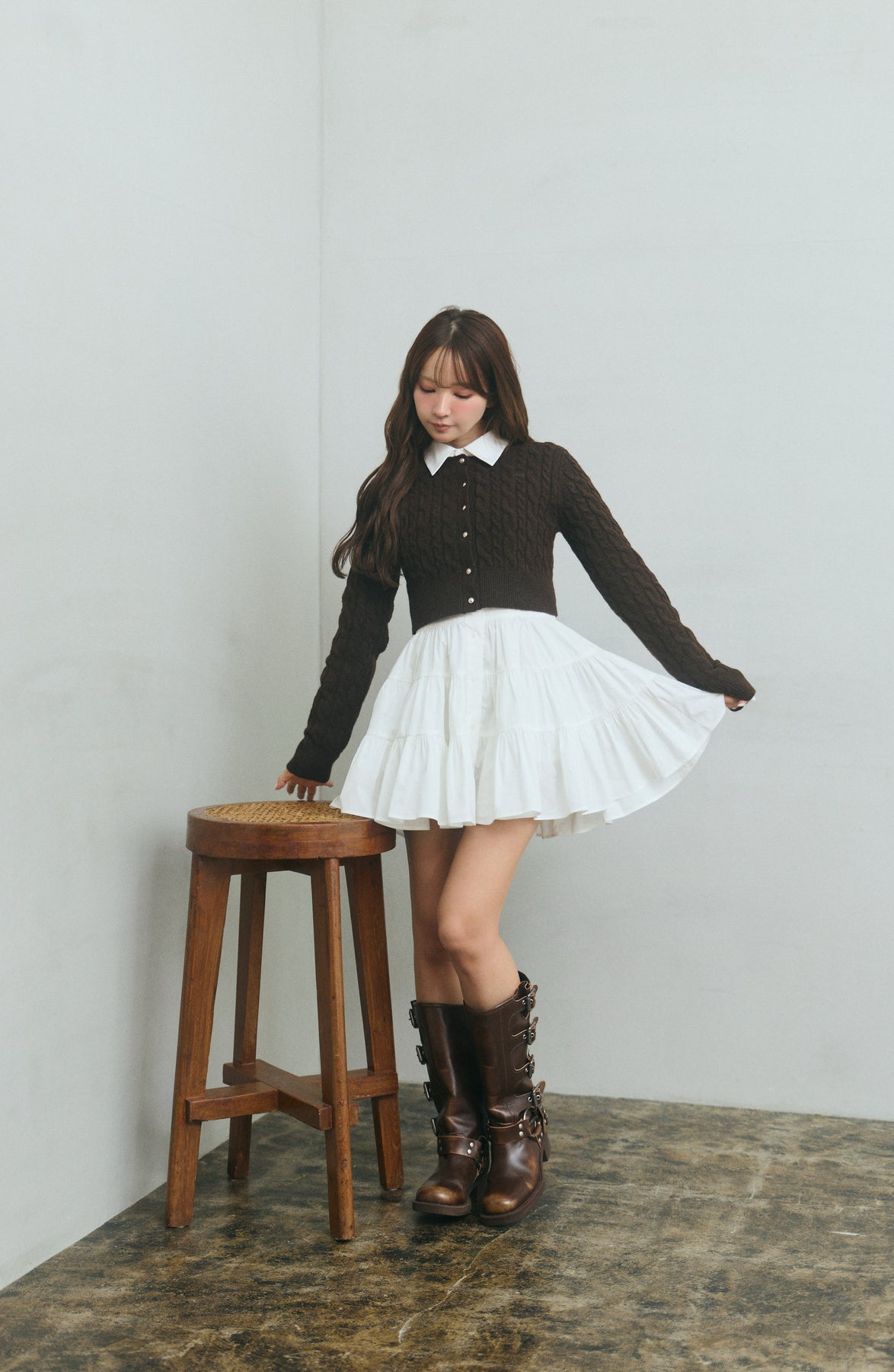ケーブルニットカーディガンとシャツミニワンピースのセットアイテム。