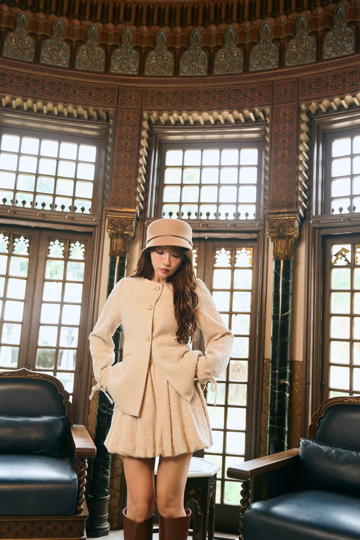 ウエストシェイプされたクラシックなシルエットが特徴のジャケットと、バルーンシルエットが脚を綺麗に見せてくれるスカートのセットアップ。ジャケットはくびれをつけ、ボタンをウエストまでにしたことで裾が開くので、腰回りもカバーされ、セットのバルーンスカートはもちろんデニムなどを合わせてもスタイルアップして魅せてくれます◎袖口のリボンでミストレアスらしいフェミニンさをプラスしました。