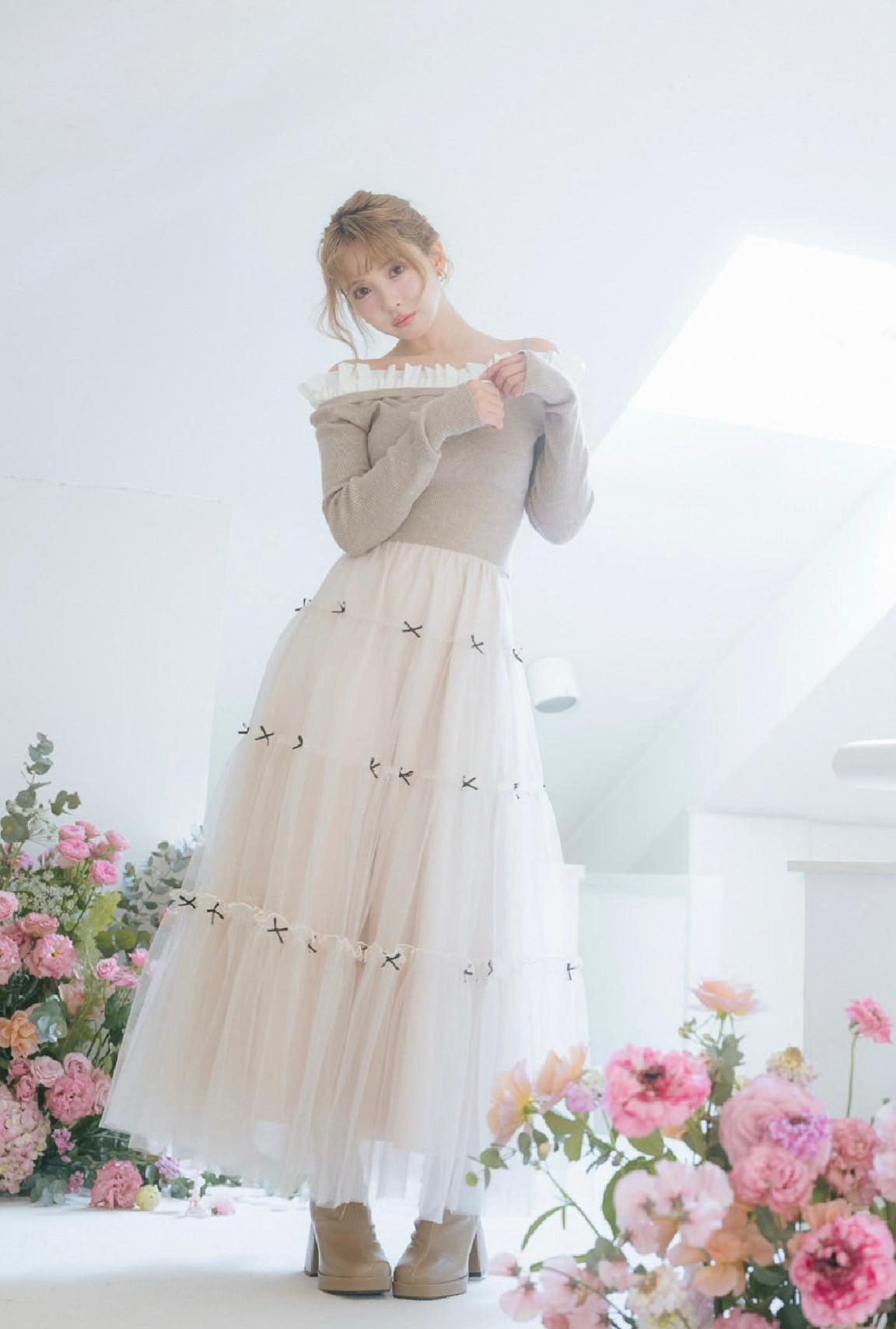 柔らかでパウダリーな表面感のチュール生地を、たっぷり贅沢にギャザーを入れ、4段ティアードに仕上げました。