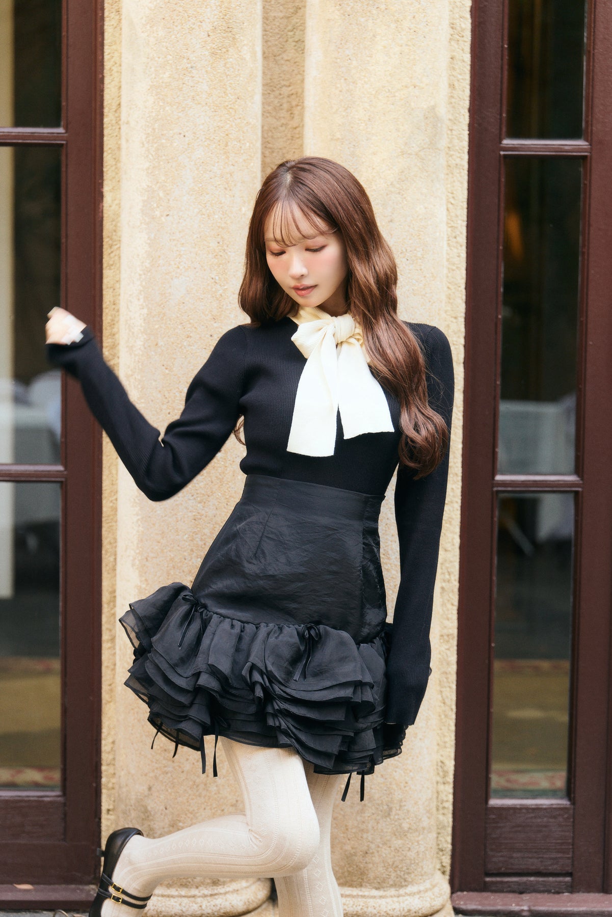 フロントのリボンタイはコーディネートによって結び方をかえてアレンジしていただけます。